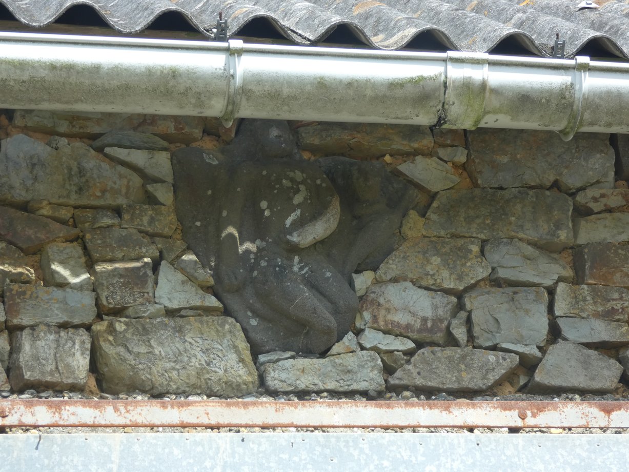 7. Kernéron + k. 0 60 m. XVIè s. Vestige d’un groupe N.-D. de Pitié provenant d’un calvaire, inséré dans une maçonnerie. [YPC 1980]
