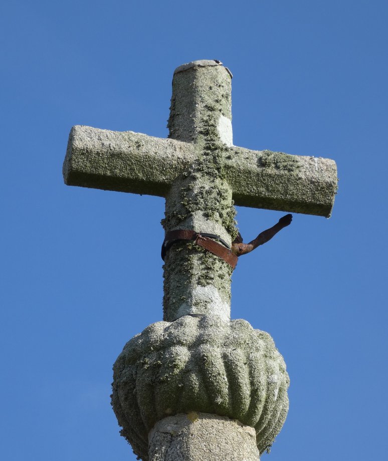 277. Lanneusfeld S-O + Croas-Deliou, g. f. 19- -. Deux degrés, socle octogonal, portant une inscription moderne illisible. Fût à pans, noeud. Croix de section octogonale à branches pointues, crucifix en fonte. [YPC 1980]