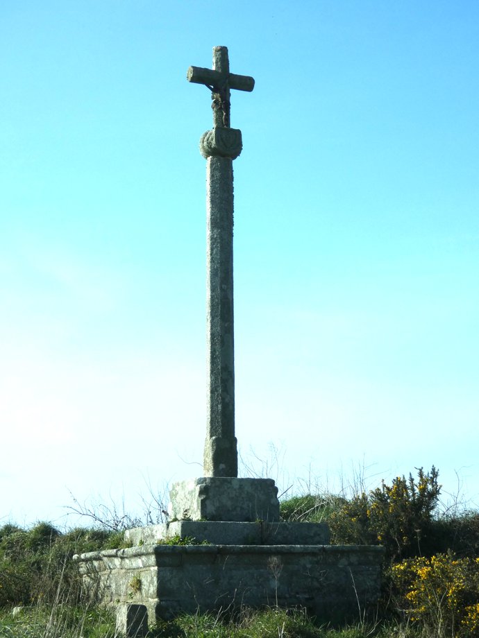 284. Poulscavennou, Croas-Iliz-Coz, g. 2,80 m. Moyen Age. Deux degrés, socle cubique au sommet à pans, croix monolithe de section octogonale avec quatre demi-cercles cantonnés. [YPC 1980]