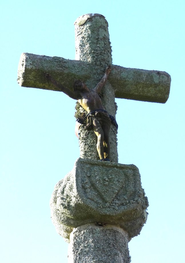 267. Kerfissien S + g. 3 m. Milieu XVIè s. Base incluse dans un mur. Degré, socle à griffes simples. Fût à pans, croix monolithe de section octogonale, crucifix en bas relief, petite loge au revers du fût. [YPC 1980]