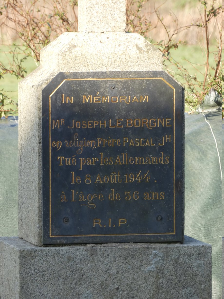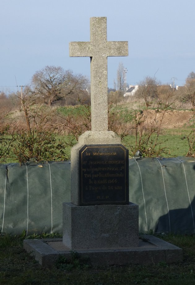 260. Cléder 0, k. 2,50 m. 1944. Degré, socle double. Croix avec crucifix: IN MEMORIAM MR JOSEPH LE BORGNE EN RELIGION FRERE PASCAL JH TUE PAR LES ALLEMANDS LE 8 AOUT 1944 A L’AGE DE 36 ANS R.I.P. [YPC 1980]
