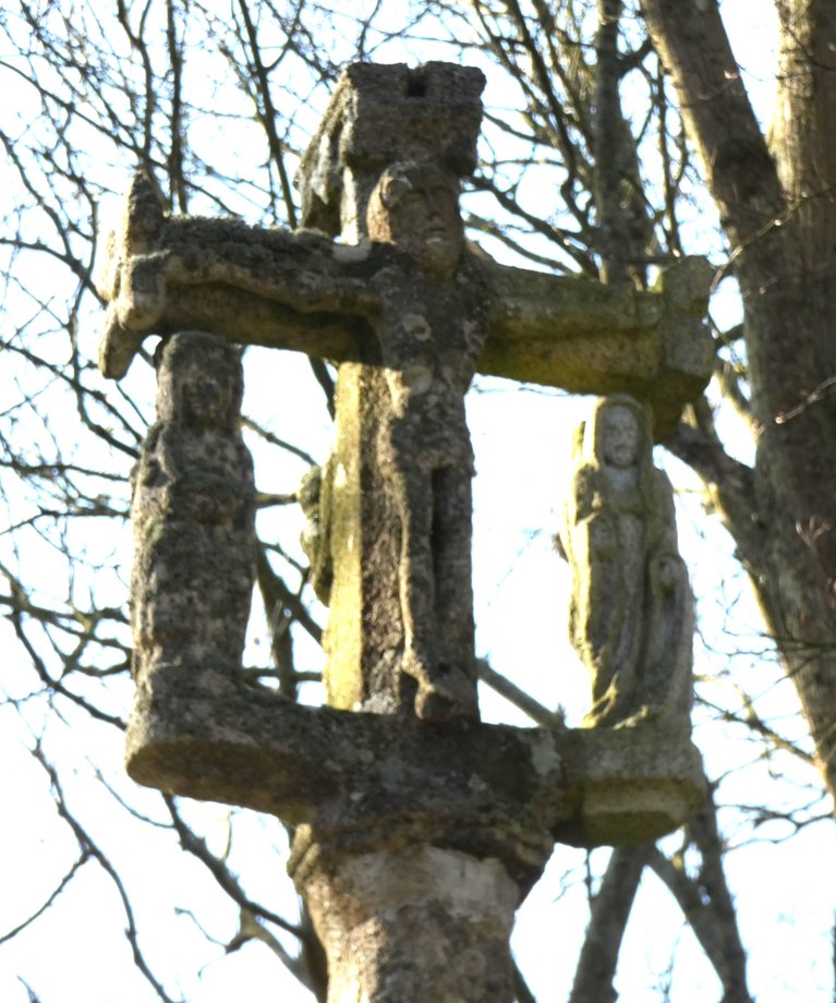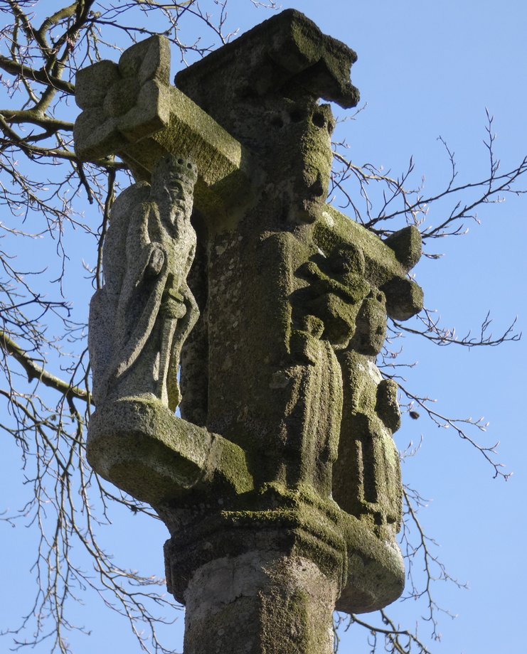 286. Tronjoly S + k. 5 m. XVè s. Mutilée. Base à table moulurée en cavet, degré. Socle cubique à griffes. Fût à pans, croisillon mutilé, statue géminée, Vierge et sainte Catherine av c l’epee et la roue, croix a eurons et dais portant crucifix et Vierge à l’Enfant. [YPC 1980] Le calvaire a été restauré. [closdesfuchsias 2025]