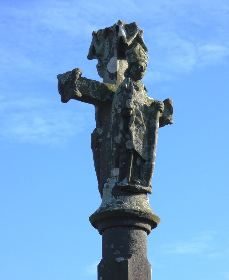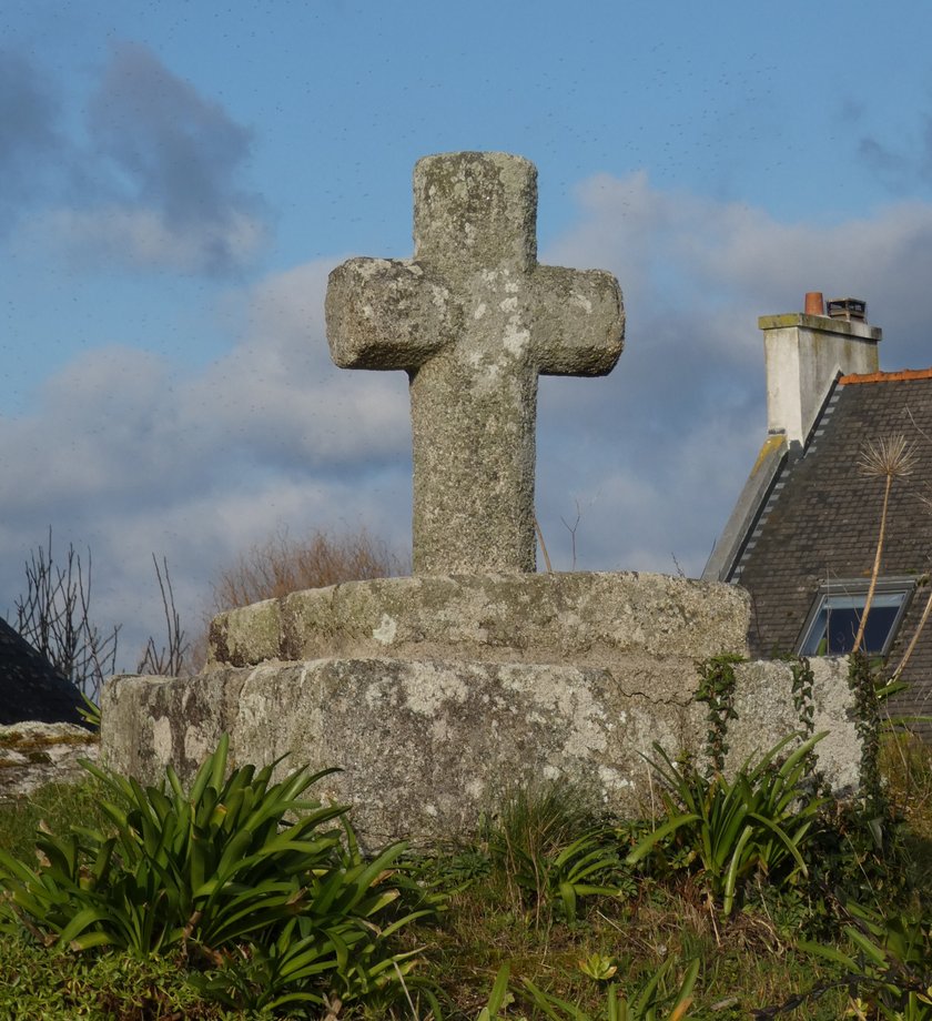 593. Goulven N-E, sur un rocher, Croas-a-Draon, g. 1,30 m. XVIIè s. Deux degrés. Petite croix de section octogonale. [YPC 1980]