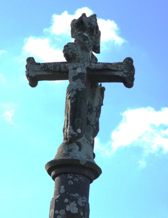 596. Lanvrein, g. 0,40 m. XVIIè s. Petit débris de croix placé récemment sur la niche de la fontaine. [YPC 1980]