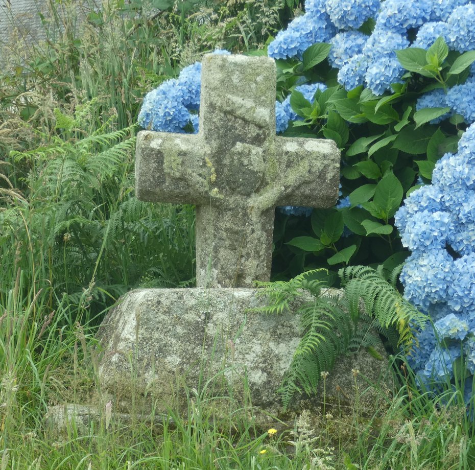 699. Toul-an-Dour + transportée du Quinquis, puis de Dorgen. g. 4 m. XVIè s. Degré, base portant les statues de Madeleine et du Christ lié. Socle cubique: DON DE LA FAMILLE LE GALL YVES VVE MADEC. C. GUEGUEN RECTEUR 1962 M. SALOMON MAIRE. Fût à pans. Croix, fleurons à godrons, crucifix. [YPC 1980]
