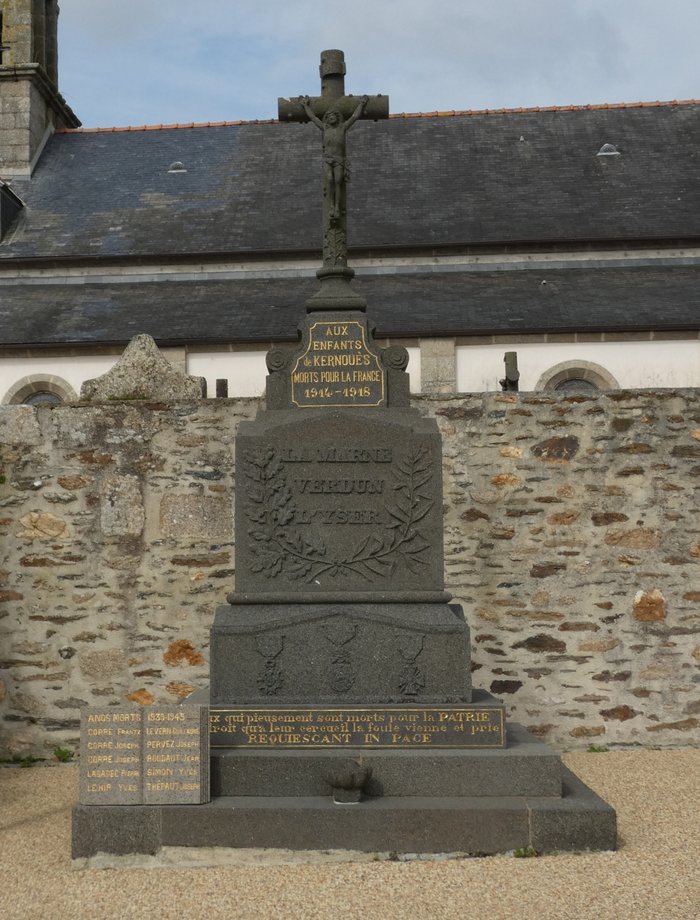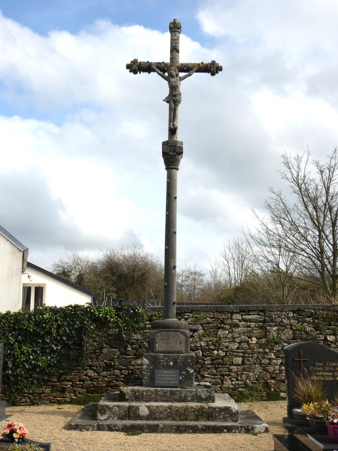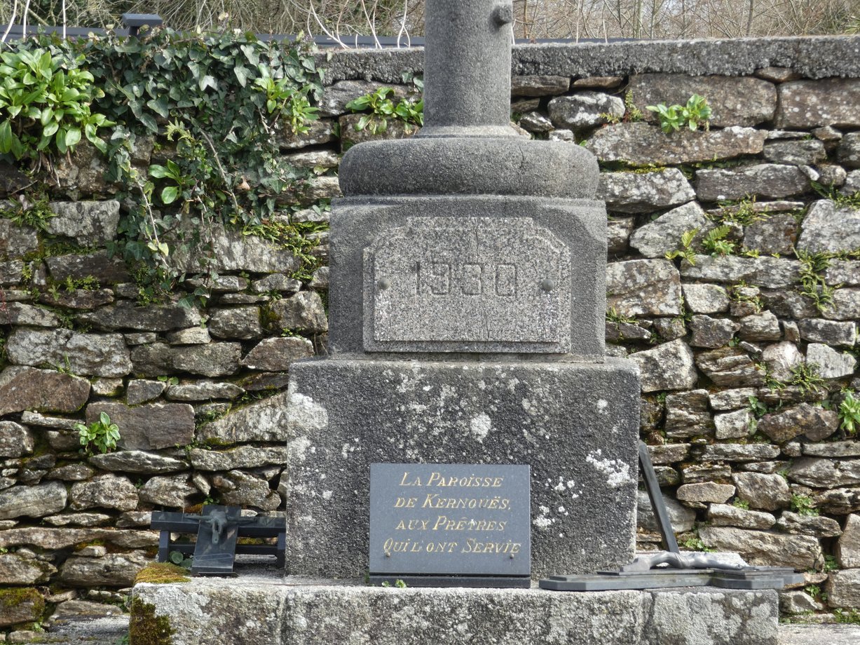 901. Kernouès, cimetière, g. c. 1930. Par Kerguiduff, Taulé. Trois degrés. Socle double: 1930 V. INIZAN DEPUTE-MAIRE, J. PIEDOYE RECTEUR. Fût rond, écots, chapiteau "celtisant". Croix fleuronnée, crucifix. [YPC 1980]