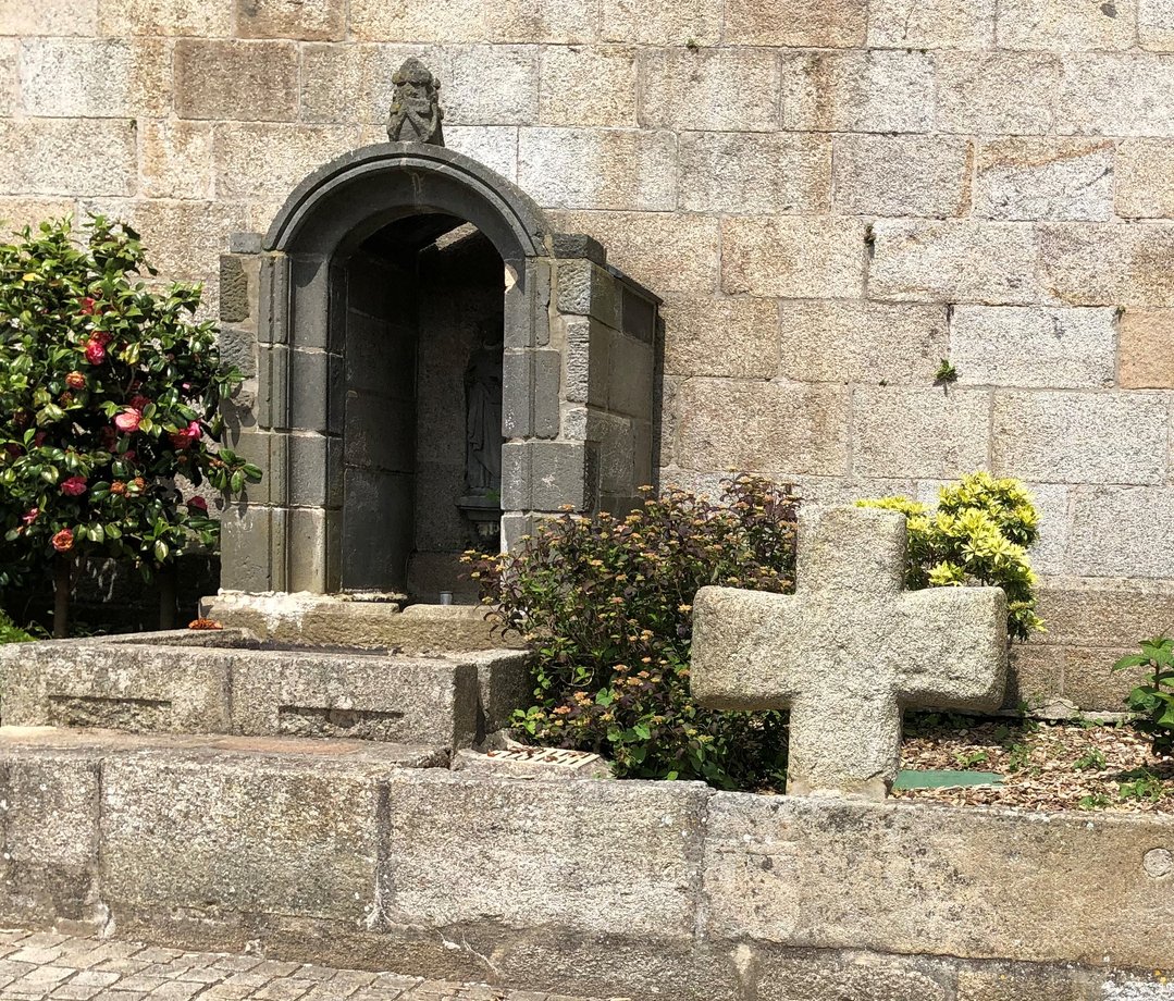 1102. Kerosven + "l’Image", nom significatif dans un pays où il y avait anciennement peu de croix historiées, g. k. 6 m. Vers 1630, par l’atelier de Roland Doré. Enclos de plan hexagonal. Trois degrés hexagonaux, corniche. Socle, pans de dessin particulier. Fût à pans. Croisillon, culots, traces de martelage au centre, statues en ronde bosse: Vierge, Jean. Croix, fleurons-boules, crucifix, statue de Jean-Baptiste. [YPC 1980]