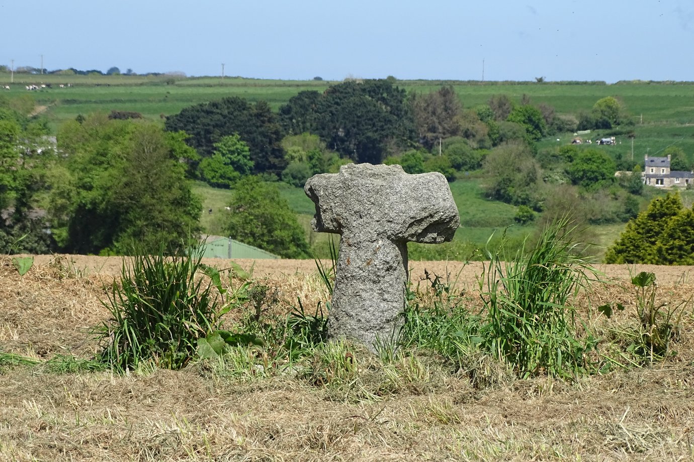 1095. Kerazan + g. 1,70 m. Haut Moyen Age. Grande croix pattée à chanfrein, de section carrée. [YPC 1980]