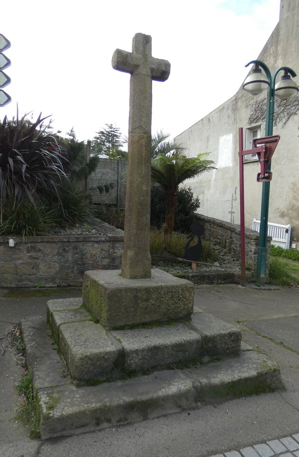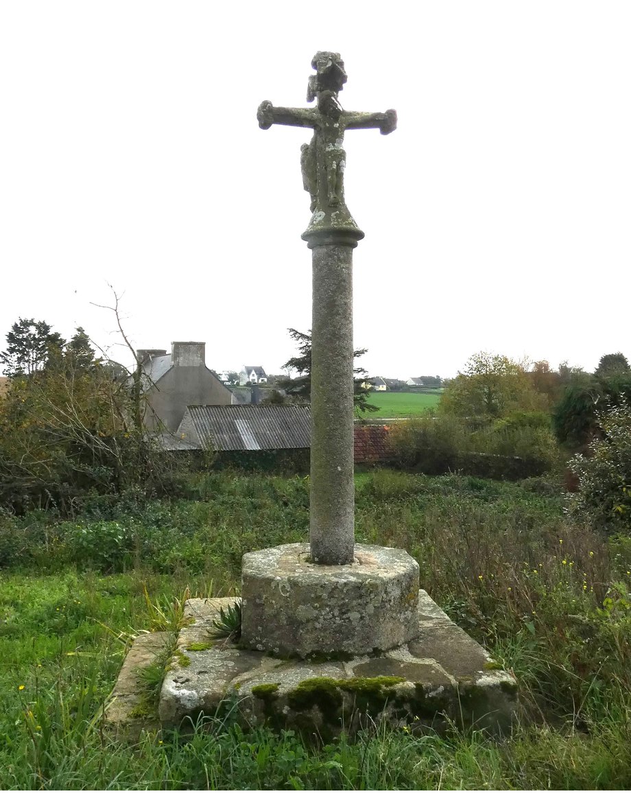 1325. Sainte-Catherine N + g. k. 4 m. Vers 1437. Trois degrés de section octogonale datés 1833. Fût rond. Croix, base tronconique armoriée, fleurons, petit dais, crucifix, Vierge à l’Enfant. Armoiries: Kersauzon (boucle de ceinturon)-Kerimel. Jean de Kersauzon, époux de Jeanne de Kerimel, prête serment au duc en 1437, dans une montre des nobles du Léon. [YPC 1980]