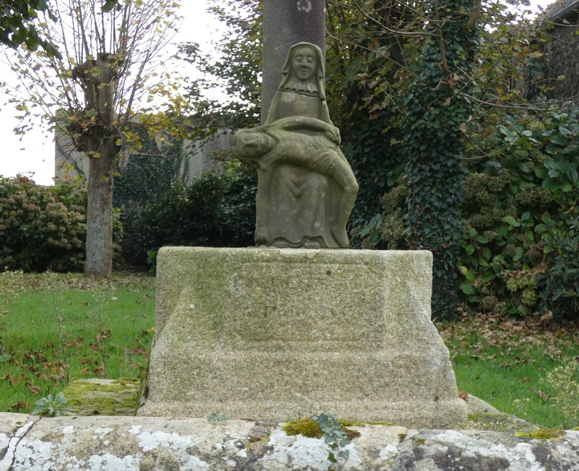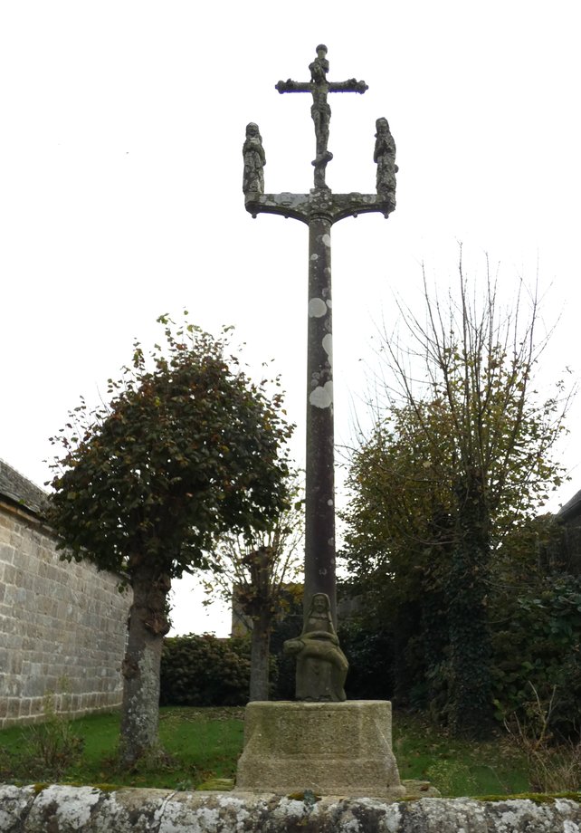 1319. La Garenne E + Croas-ar-Vossen, + g. 6 m. 1626. Soubassement élevé. Deux degrés. Socle: 1626 RESTAUREE 1903 MISSION 10 JOURS D’INDULGENCES PATER AVE, de forme semi-sphérique, le socle porte masques et tête de mort. Fût rond, écots. Croisillon, statues géminées: Vierge-chevalier, Jean-saint Yves. Croix de section ronde, fleurons-boules, crucifix. Sculptures de type fruste. [YPC 1980]