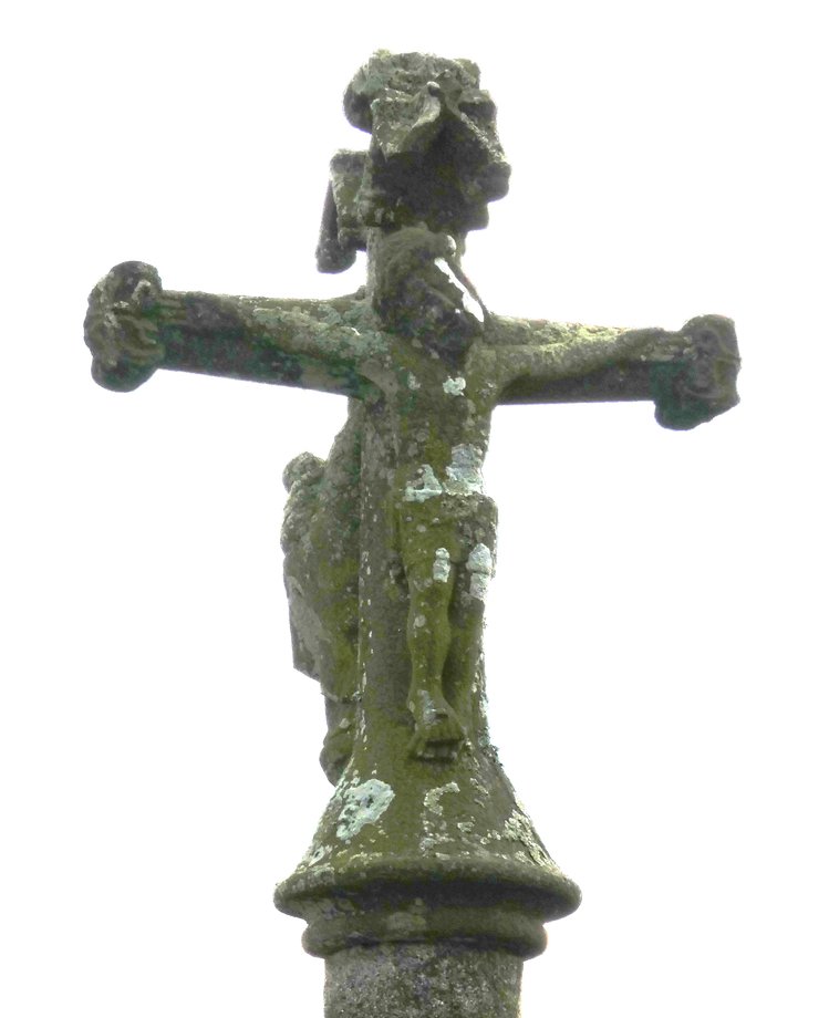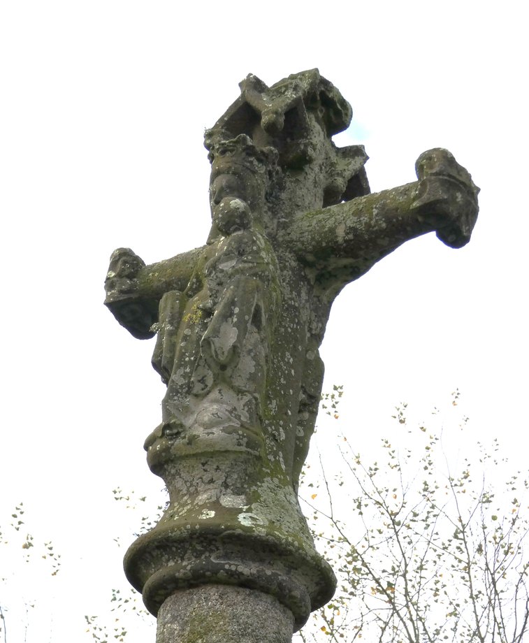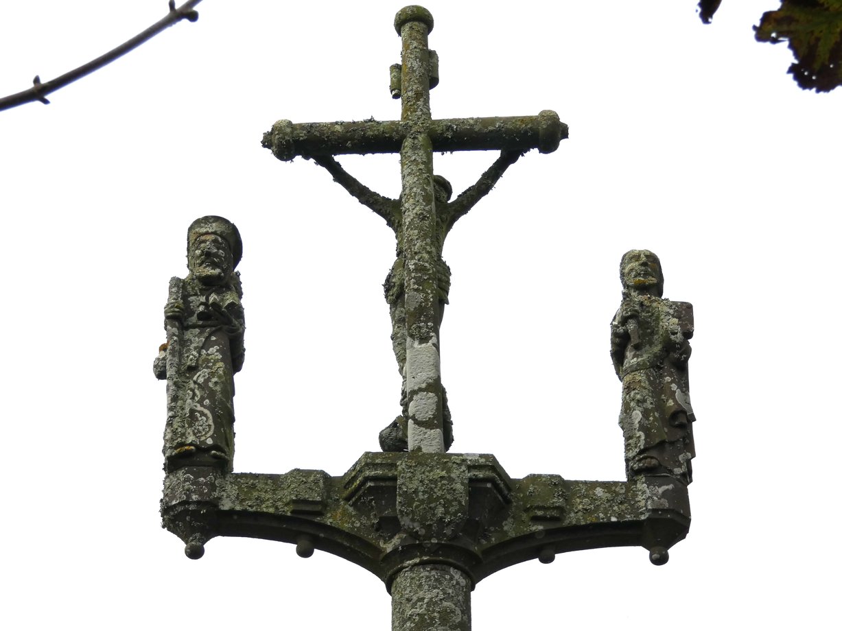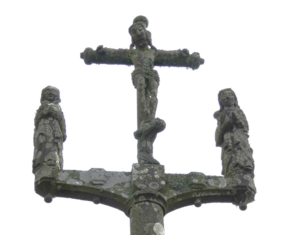 1321. Mespaul, cimetière, g. 5 m. XVIIIè s.,1906. Trois degrés, corniche. Socle à pans, fût rond, écots, chapiteau. Croisillon aux anges, ailes repliées sur la poitrine, sainte Face, ange à la banderole, statues géminées: Jean-Paul, Vierge-Pierre. Croix, fleurons (1906), crucifix, saint Pol (tête refaite). [YPC 1980]