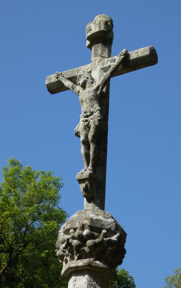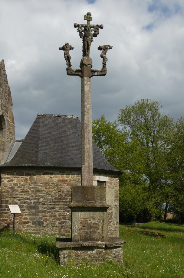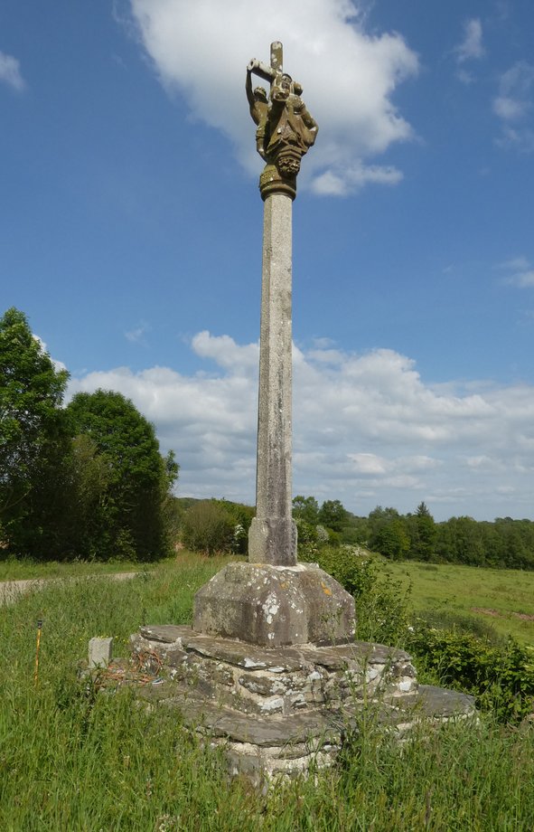 1486. Saint-Laurent, g. k. 6 m. XVIè s. Trois degrés hauts en schiste. Socle cubique. Fût rond, écots. Croisillon, culots feuillagés, statues géminées: Vierge-Laurent, Jean-évêque. Croix, fleurons godronnés, crucifix, anges au calice, Christ ressuscité. [YPC 1980]