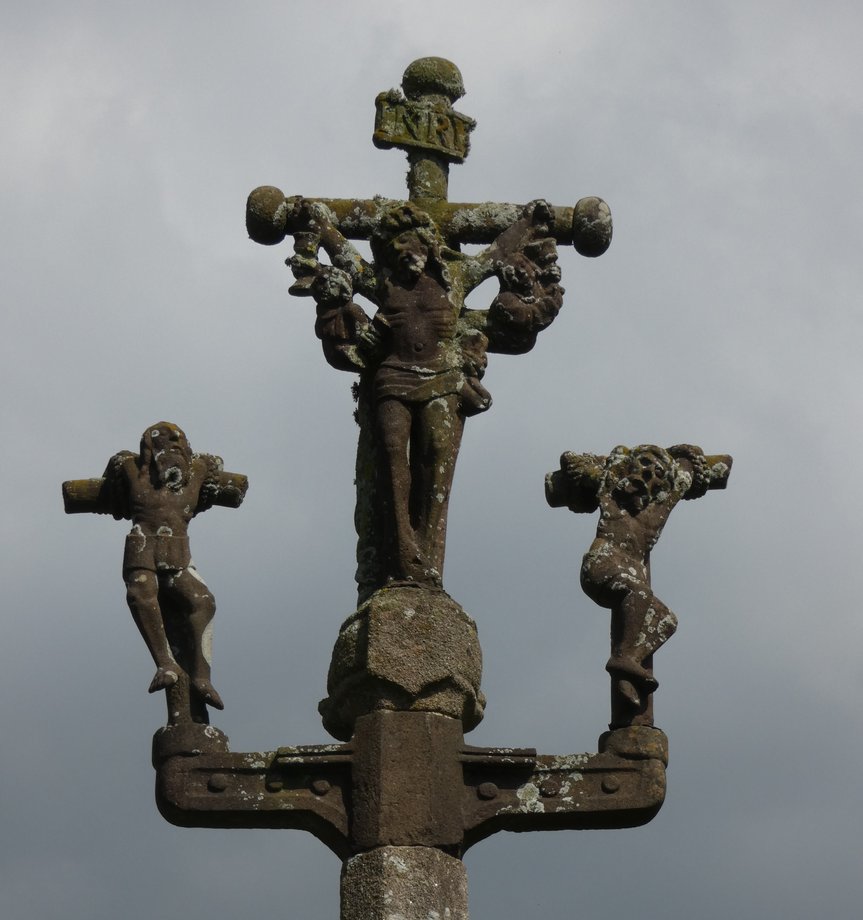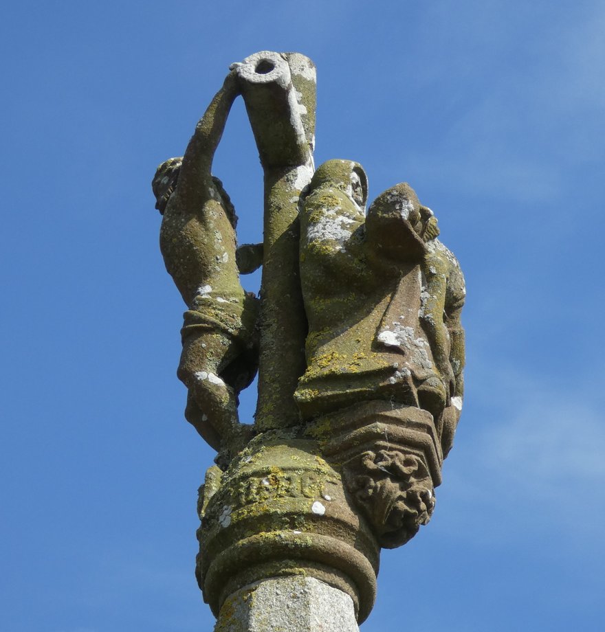1477. Pleyben,enclos no 2, grand calvaire, g. k. 7 m. 1555, 1742. Par l’atelier des frères Henry et Bastien Prigent, auteurs du calvaire de Plougonven (1550) et par Ozanne (1650). Grand massif architecturé, arcades, avec contreforts: IA.I. LE BORGNE 1738/H.I.B.LE. MOVLIN. F. 1739/H.G. POS 1740. H.M./H.H. BAVT. R. 1742. Massif postérieur aux groupes qui, la plupart, datent de 1550, selon l’inscription de la statue de saint Germain au porche de l’église: EN L’HONNEUR DE DIEV ET (NOTRE) DAE ET MONSIEUR S GERMAIN CESTE CROIX FVST COMECE 1555. Les groupes se suivent sur la frise basse, de gauche à droite, de manière chronologique: Annonciation, Visitation, Nativité, Adoration des Mages, Fuite en Egypte, Jésus au milieu des Docteurs, Entrée à Jérusalem: OSANNA FILII DAVID. Cène: FAIST A BREST PAR M I V OZANNE ARCHETECTE. Lavement des pieds: TV MIHI LAVAS PEDES 1650, Marché de Juda, Agonie, Arrestation, Jésus emmené, Jugement de Pilate, Christ aux outrages, Repentir de Pierre, Flagellation, Couronnement d’épines. La séquence est interrompue par une Vierge de Pitié. La série des groupes supérieurs commence à l’opposé de l’Annonciation et va dans le sens inverse, de droite à gauche: Pilate se lave les mains, Jésus conduit au supplice, Portement de croix, Soldats au calvaire, Crucifixion, Mise au tombeau, Descente aux enfers et Résurrection. Sur les contreforts, se mariant avec la scène des trois croix, cavalier et personnage au phylactère: TOLLE TOLLE CRVCIFIGE EVM. Les larrons portent leurs noms GISMAS et DISMAS, le premier en caractères gothiques, le second en capitales romaines, différence que l’on constate dans les inscriptions de Plougonven; leurs âmes sont emportées par un ange et par un démon. Fût central orné d’écots. Croisillon, culots feuillagés, statues: Vierge, Jean. Croix, branches rondes, écot, fleurons-boules, crucifix, anges aux calices. Un ange au sommet prend l’âme de Jésus, au revers, Christ ressuscité. [YPC 1980] Un soldat romain regarde de loin le Christ en Croix [gerfautd 2009]
