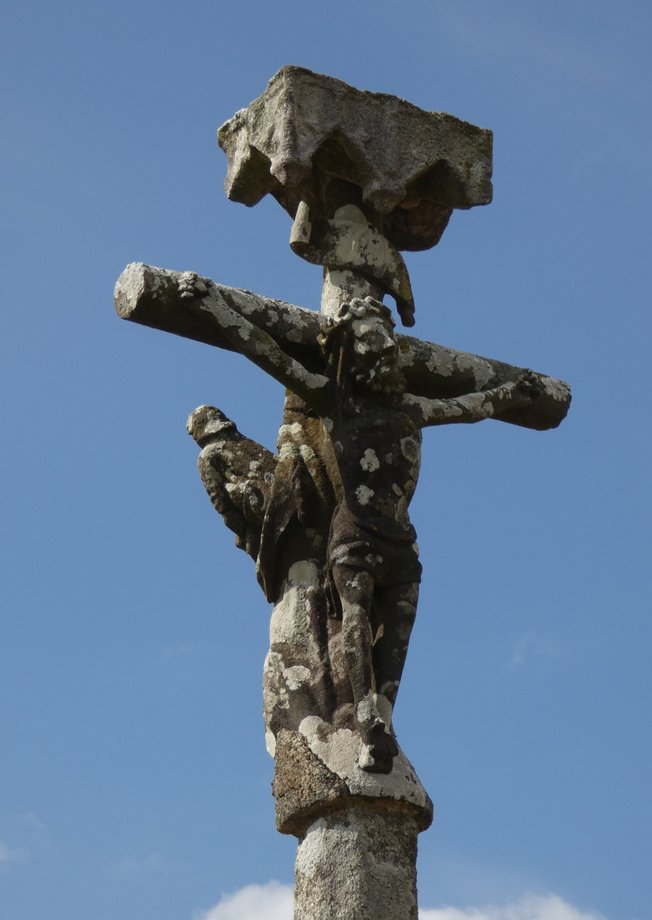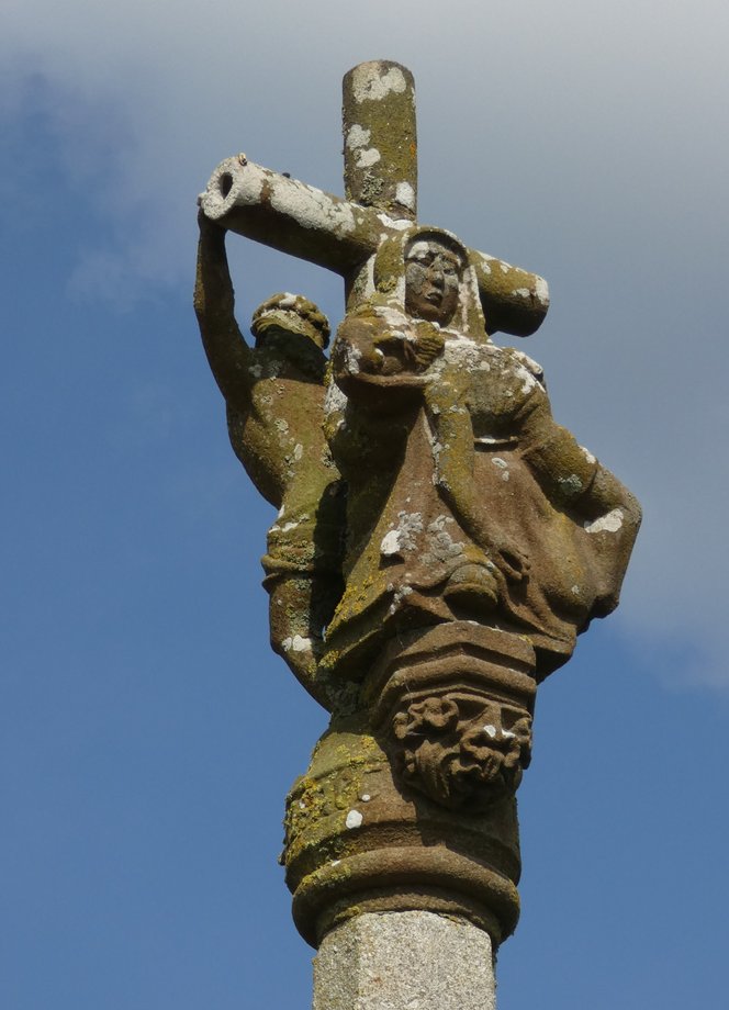 1461. Croas-Nu + k. 4 m. XVè s. Placée contre le mur d’une maison, perpendiculairement à la voie. Socle cubique: RESTAUREE PAR MARC DIBIT ET MARIE ANNE FRABOLOT LE IO - - - 1887. Fût à pans. Croix, base tronconique: G GALLOU en lettres gothiques. Croix, écots, dais à accolade, crucifix, Vierge, l’Enfant porté sur le bras droit. [YPC 1980] Kroaz Nu sur carte IGN [vvv3 2019]
