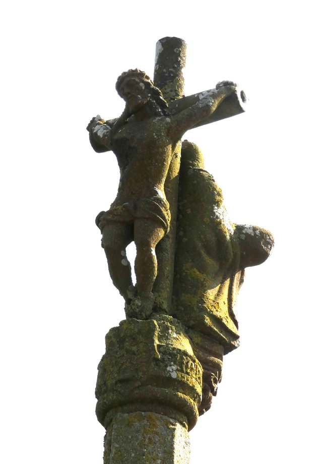 1463. Le Drevers E + s k. c. 5 m. XVIè s. Trois degrés. Socle cubique, Vierge de Pitié. Fût rond, écots. Croisillon, culots moulurés, écu au centre (martelé), statues géminées: Pierre-Jean, Paul-Vierge. Croix de section octogonale (moderne), crucifix. [YPC 1980]