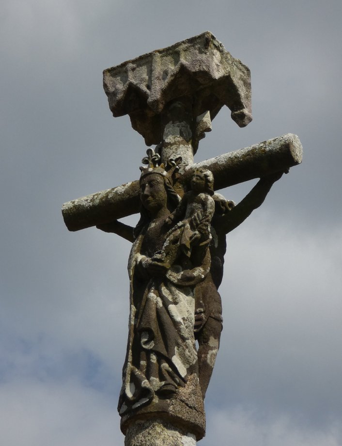 1484. Restavidan 0 + g. k. 4,50 m. XVè s. Deux degrés. Socle cubique. Fût à pans interrompus par quatre boutons. Croix, base tronconique, crucifix, anges aux calices, dais, Vierge à l’Enfant. Sculpture de grande qualité. [YPC 1980]
