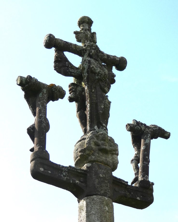 1474. Lannélec, g. k. s. 5 m. XVIè s. Soubassement élevé. Fût à pans, griffes. Croisillon, consoles, gibets des larrons (deux statues manquent). Croix, fleurons-boules, crucifix, anges aux calices, Vierge à l’Enfant, écu muet. [YPC 1980]