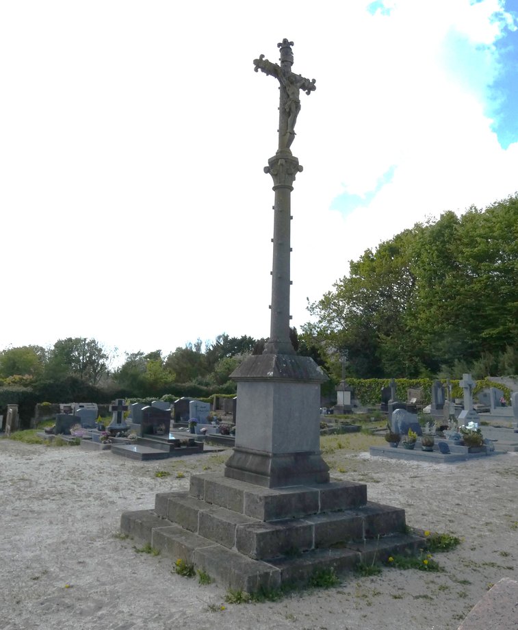 1519. Kerhant + g. f. 1874. Trois degrés. Socle cubique, pans et niche: F. P. BILLON NER - - - 1874. Croix monolithe chanfreinée, crucifix fonte. [YPC 1980]