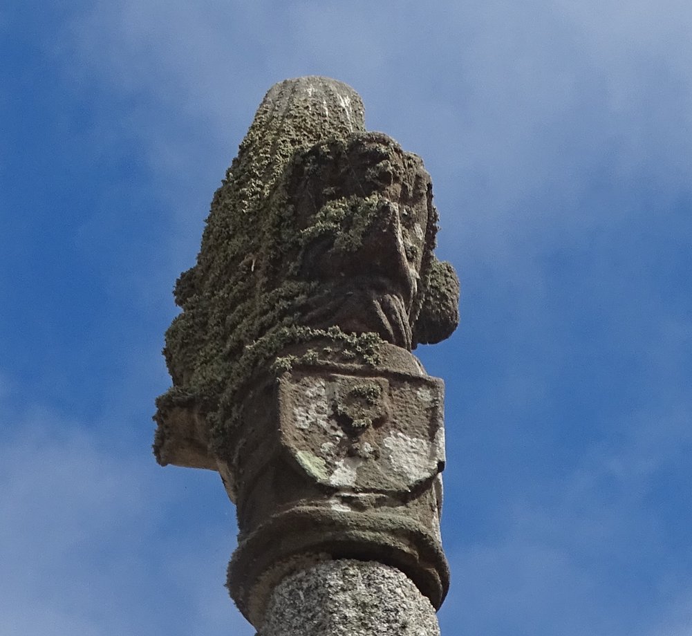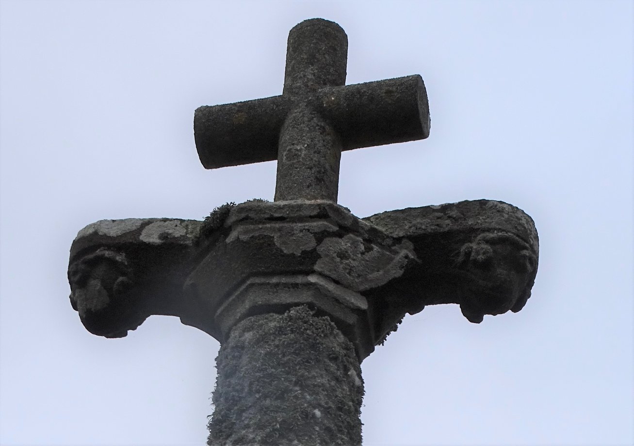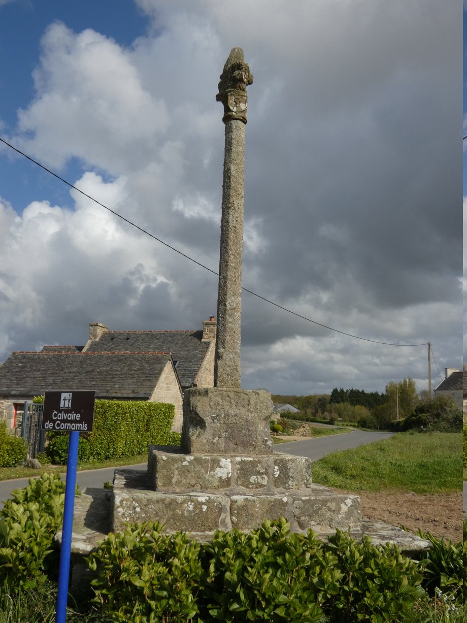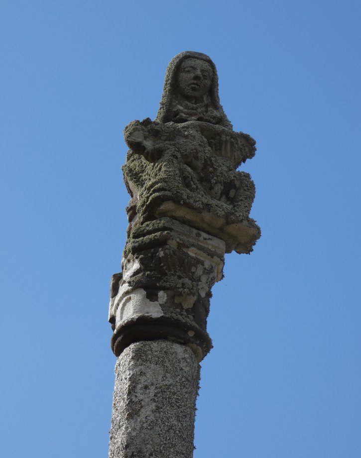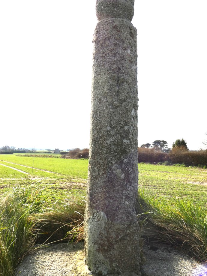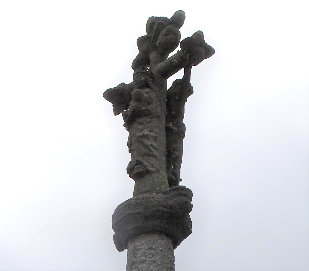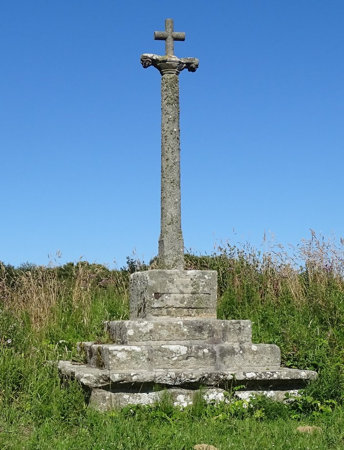 1835. Cornamis + g. k. 5 m. 1589. Trois degrés, corniche. Socle cubique à griffes: YVO QVEGVINER 1589. Fût à pans, noeud, godrons et canaux, ange orant, écu au calice. Vierge de Pitié en place de croix. [YPC 1980]