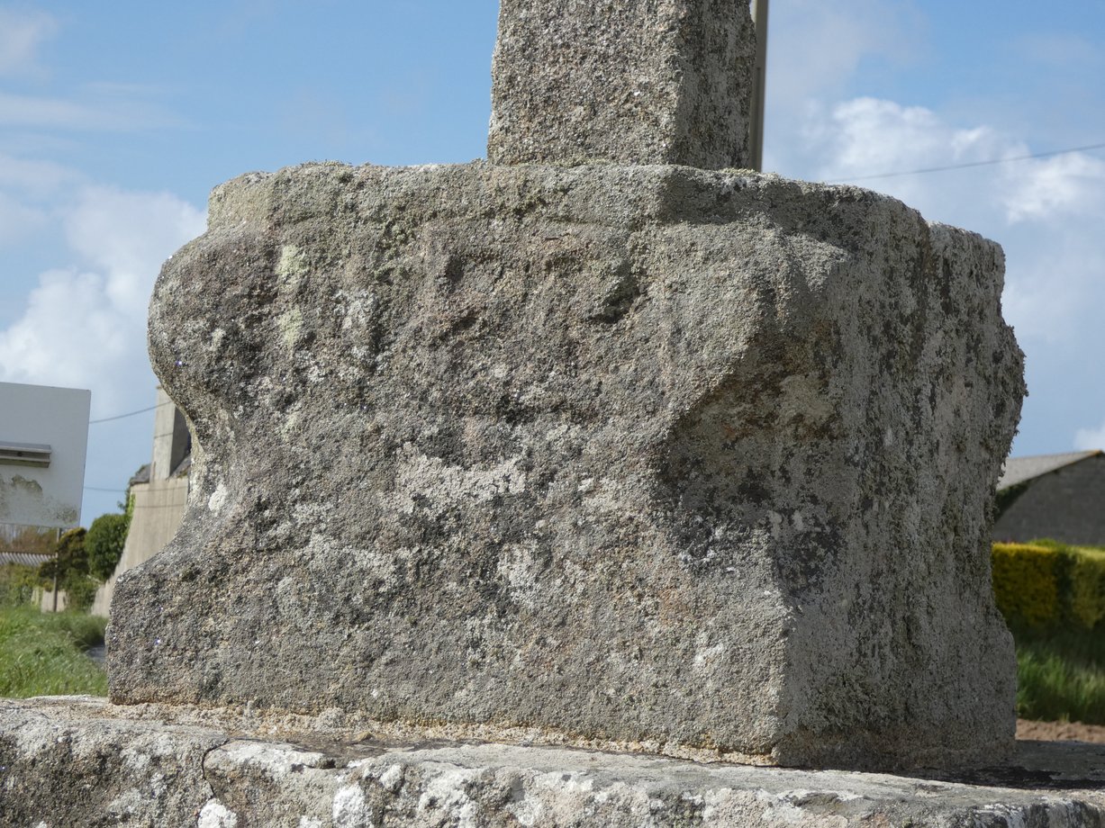 1845. Lanrial + g. 2,50 m. Vers 1550. Sur un mur de clôture, socle à corniche, base de croix formé d’un élément de stèle. Croix de section octogonale, crucifix, titulus en lettres gothiques: INRY. [YPC 1980]