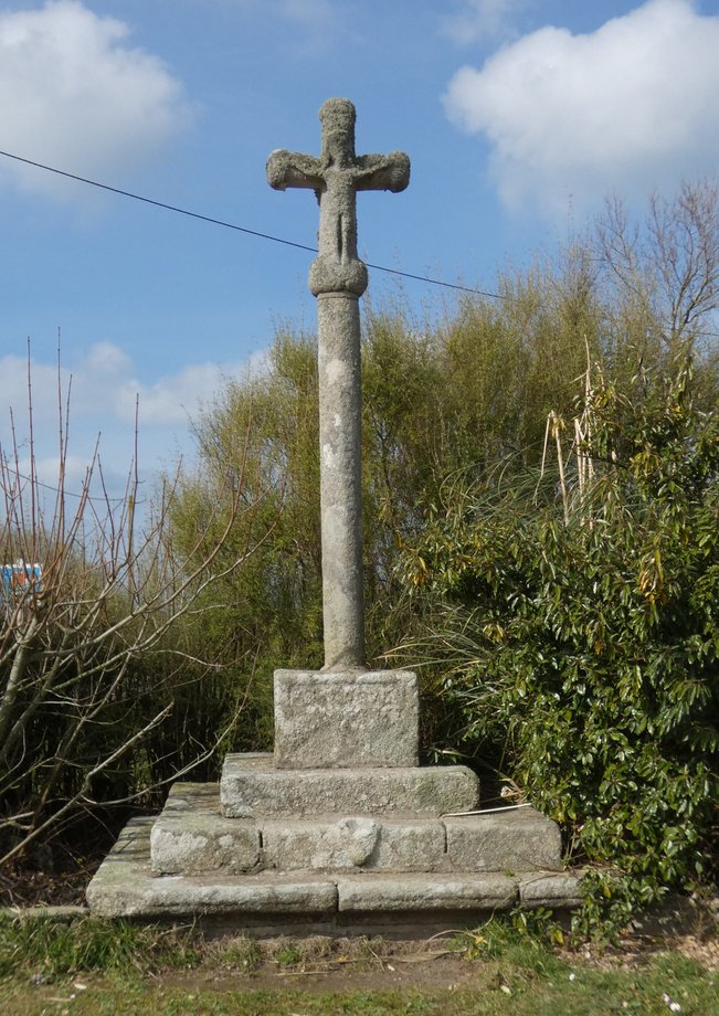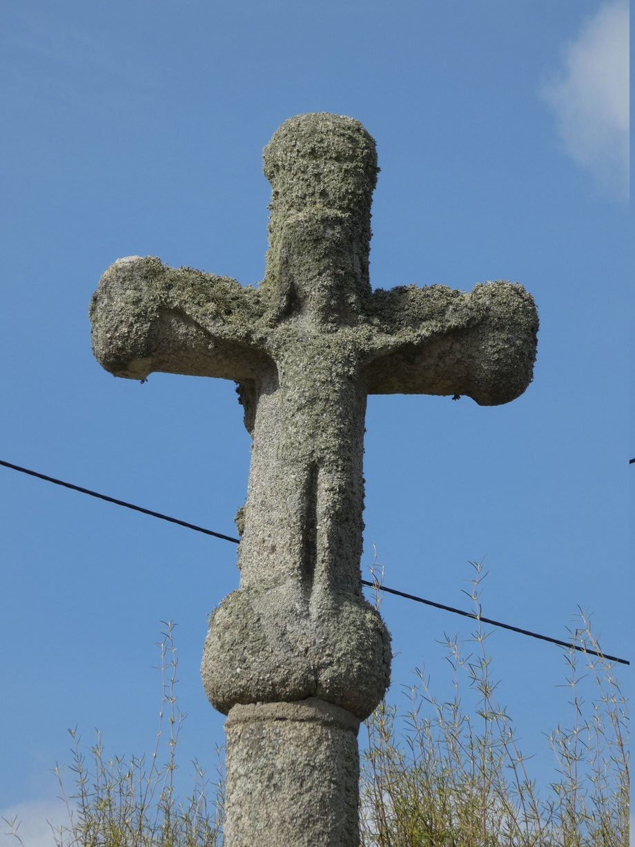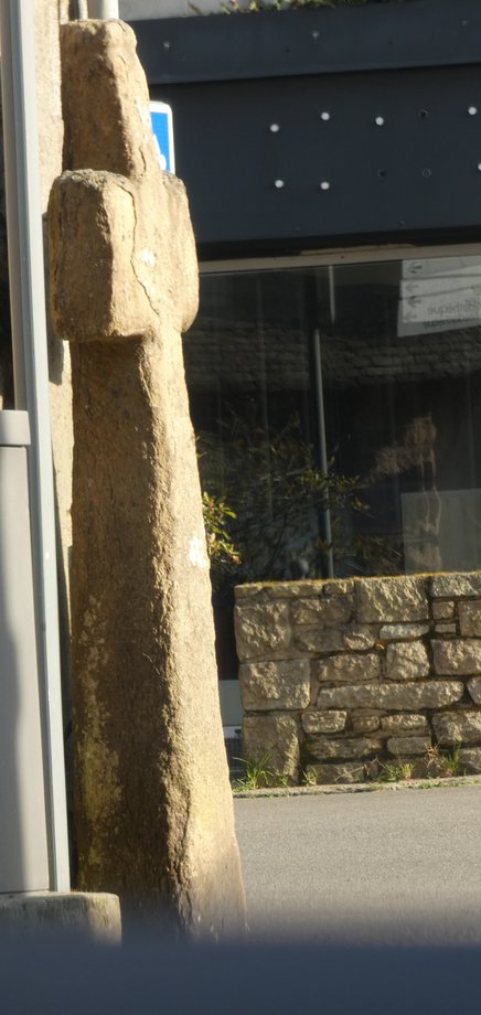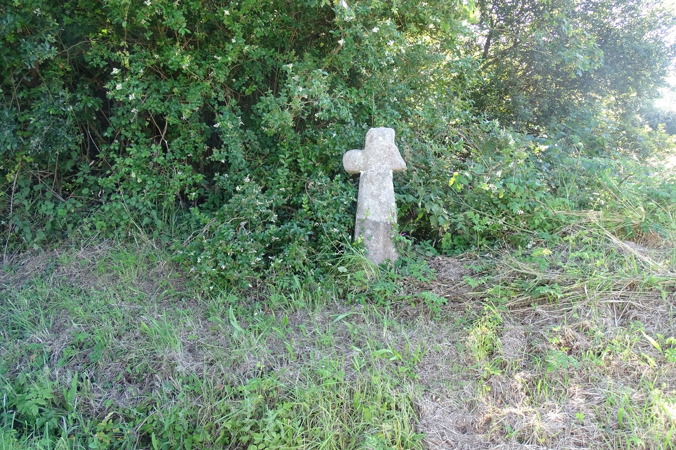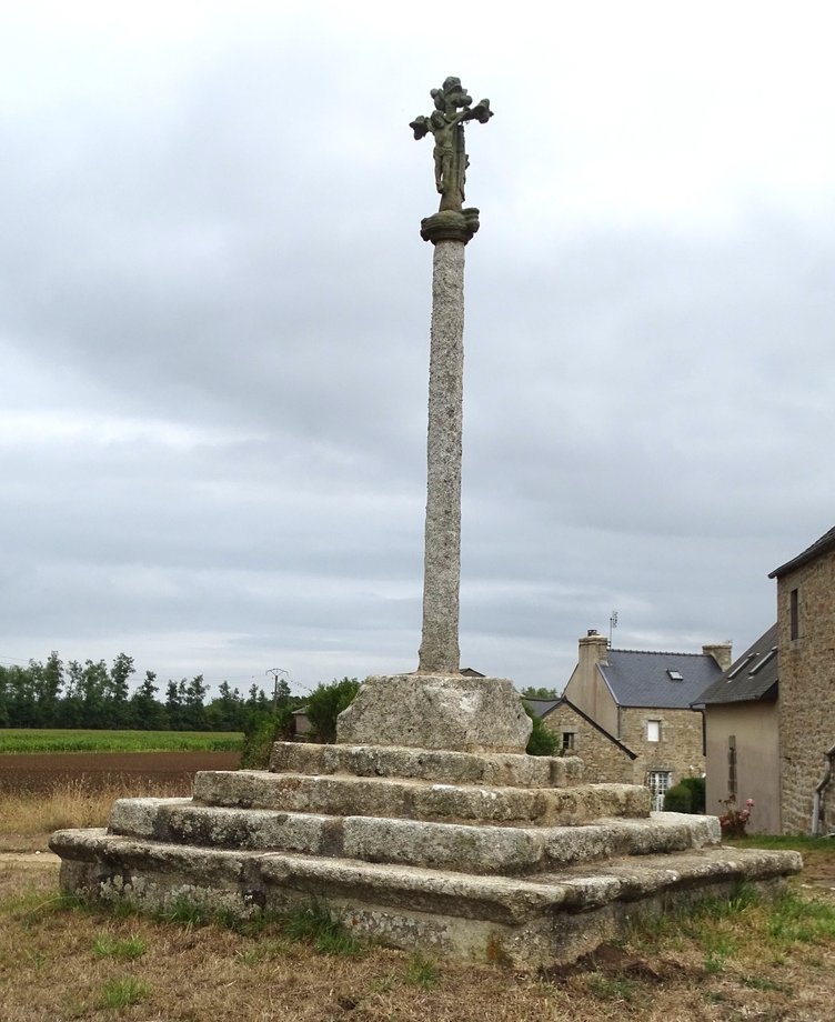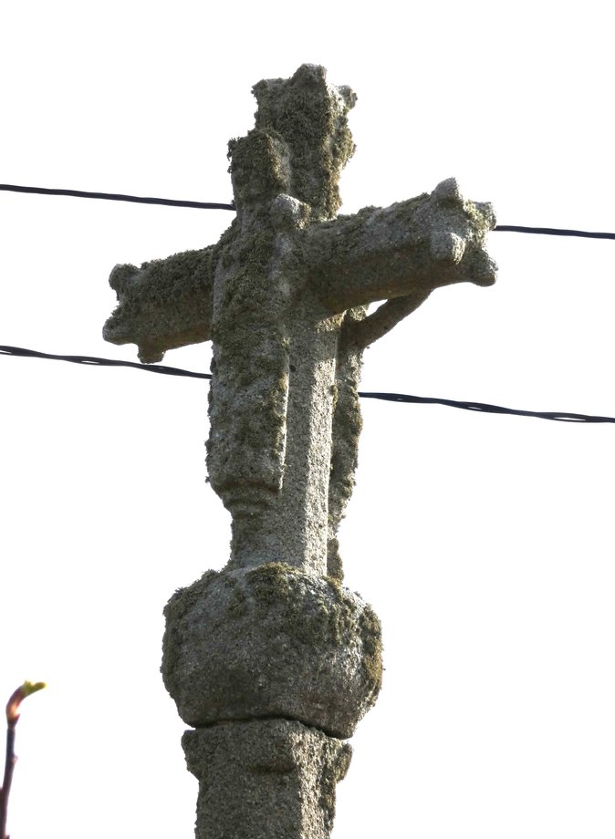 1836. La Croix, g. 2 m. XVIè s. Soubassement à deux degrés. Stèle préchrétienne, huit pans. Croix de section carrée, crucifix fruste. Dans le voisinage immédiat du monument se dressent deux autres stèles du même type que celle qui porte la croix. [YPC 1980]