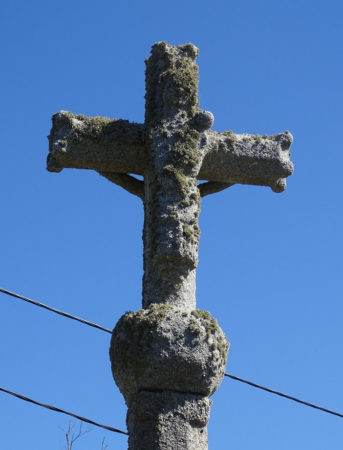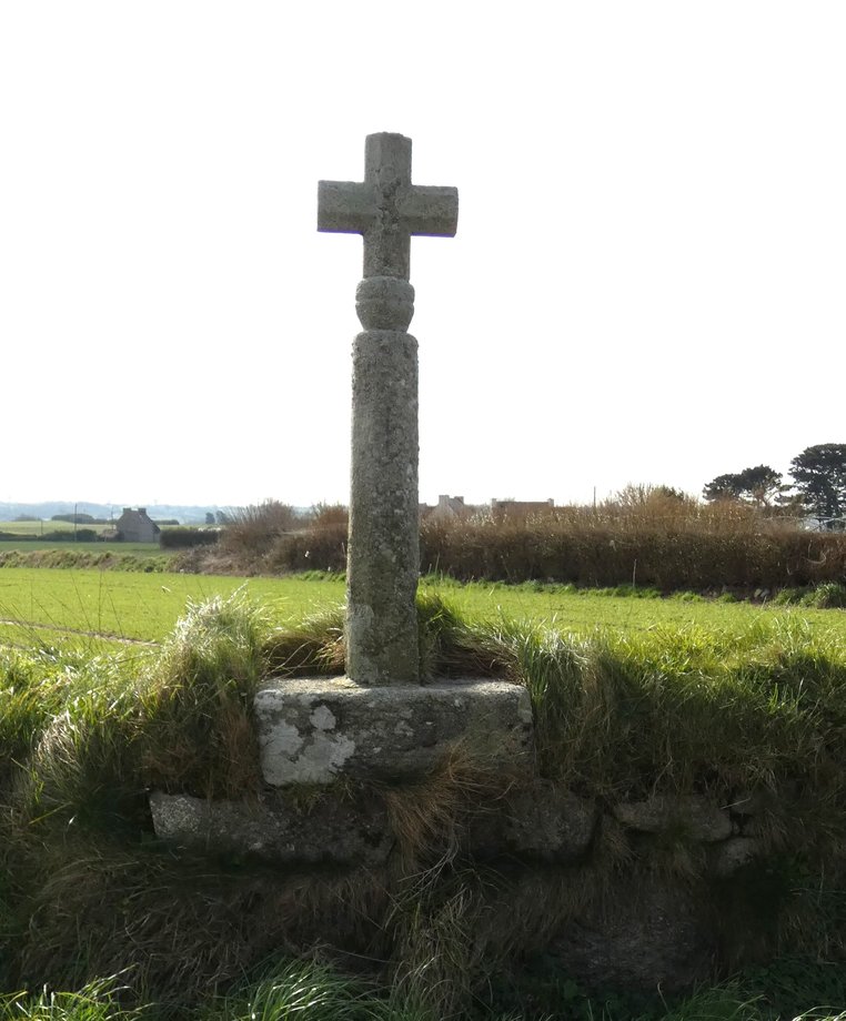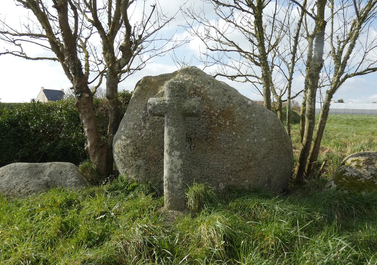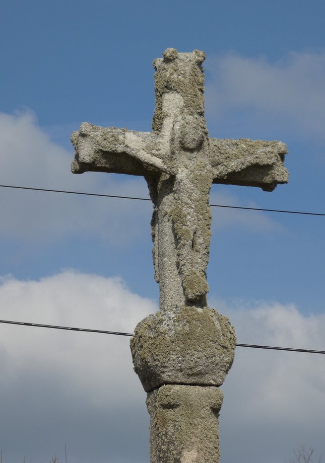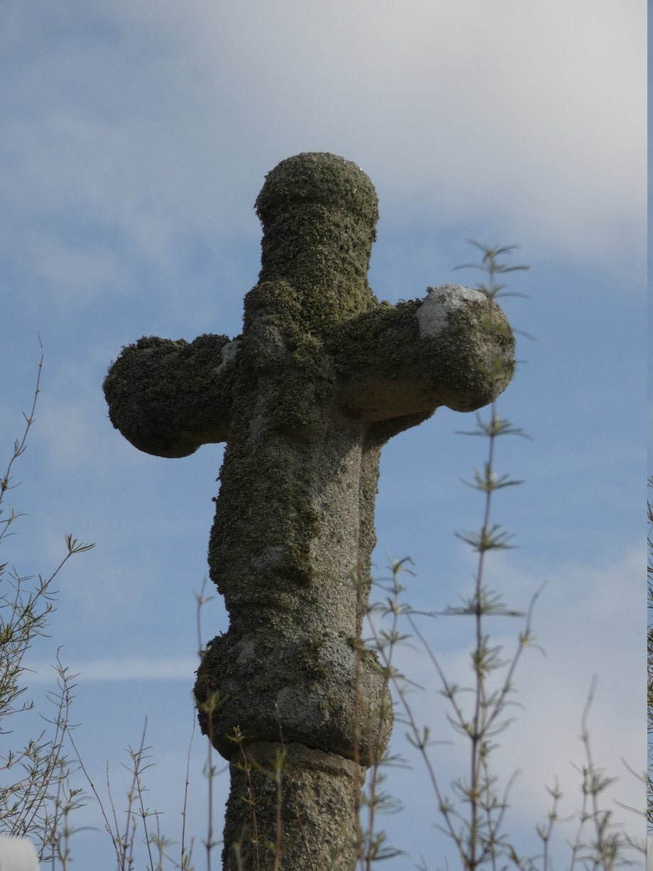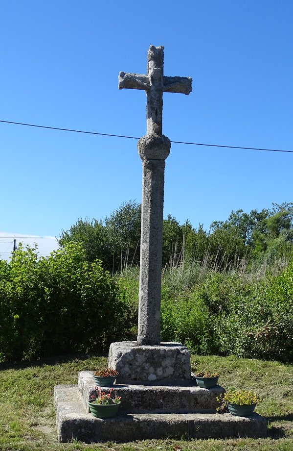 1836. La Croix, g. 2 m. XVIè s. Soubassement à deux degrés. Stèle préchrétienne, huit pans. Croix de section carrée, crucifix fruste. Dans le voisinage immédiat du monument se dressent deux autres stèles du même type que celle qui porte la croix. [YPC 1980]
