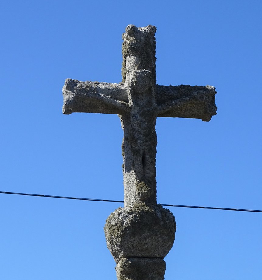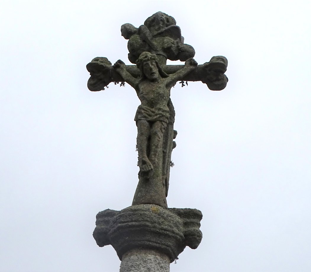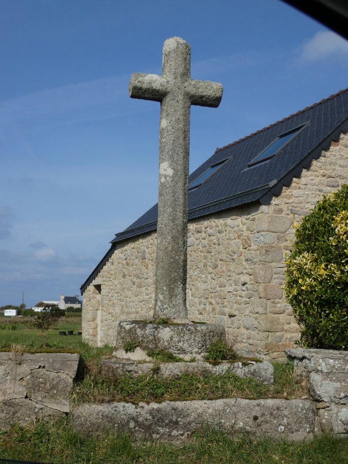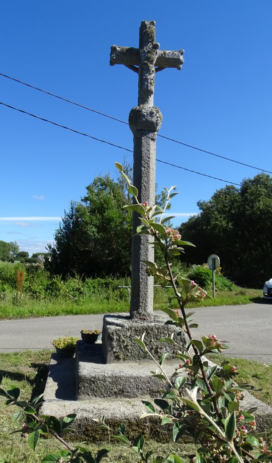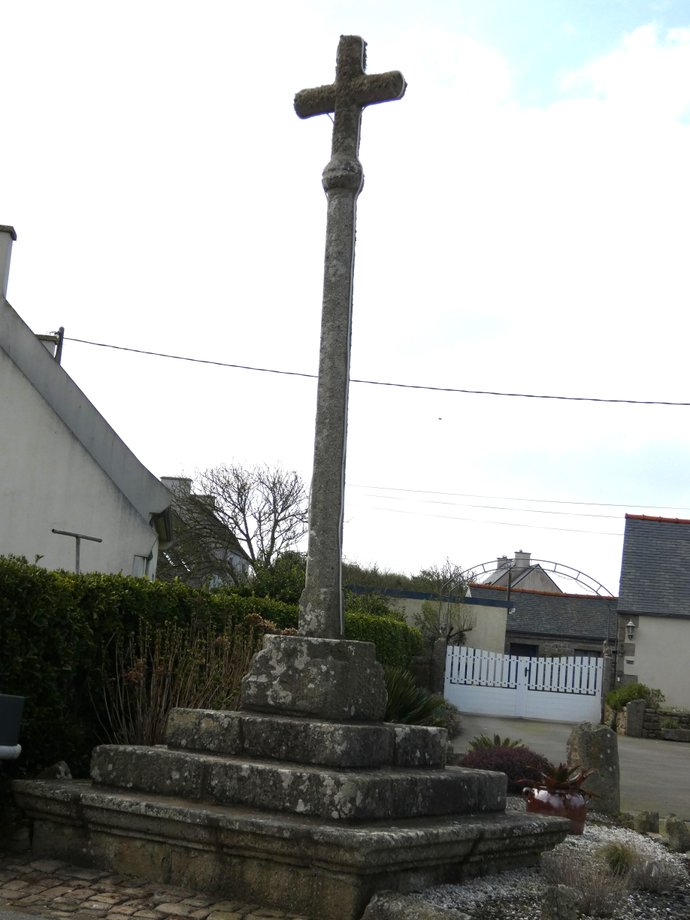 1851. Saint-Antoine, g. k. 4,50 m. XVIè, XVIIIè s, 1942. Dans un enclos de plan trapézoïdal. Trois degrés. Socle cubique: MISSION 1942 AR BED A DRO AR GROAZ A JOM DIVRALL. On mesurera l’humour de l’inscription... La croix fut inaugurée en présence de quelques curieux de l’armée.-occupante (le monde tourne, la croix demeure stable)... Signature du sculpteur: GUENOLE, LANDERNEAU. Fût, chapiteau, croix à branches rondes, crucifix. Un vestige de l’ancienne croix demeure dans la maison voisine. De la croix de bois antérieure, crucifix déposé au presbytère. [YPC 1980]