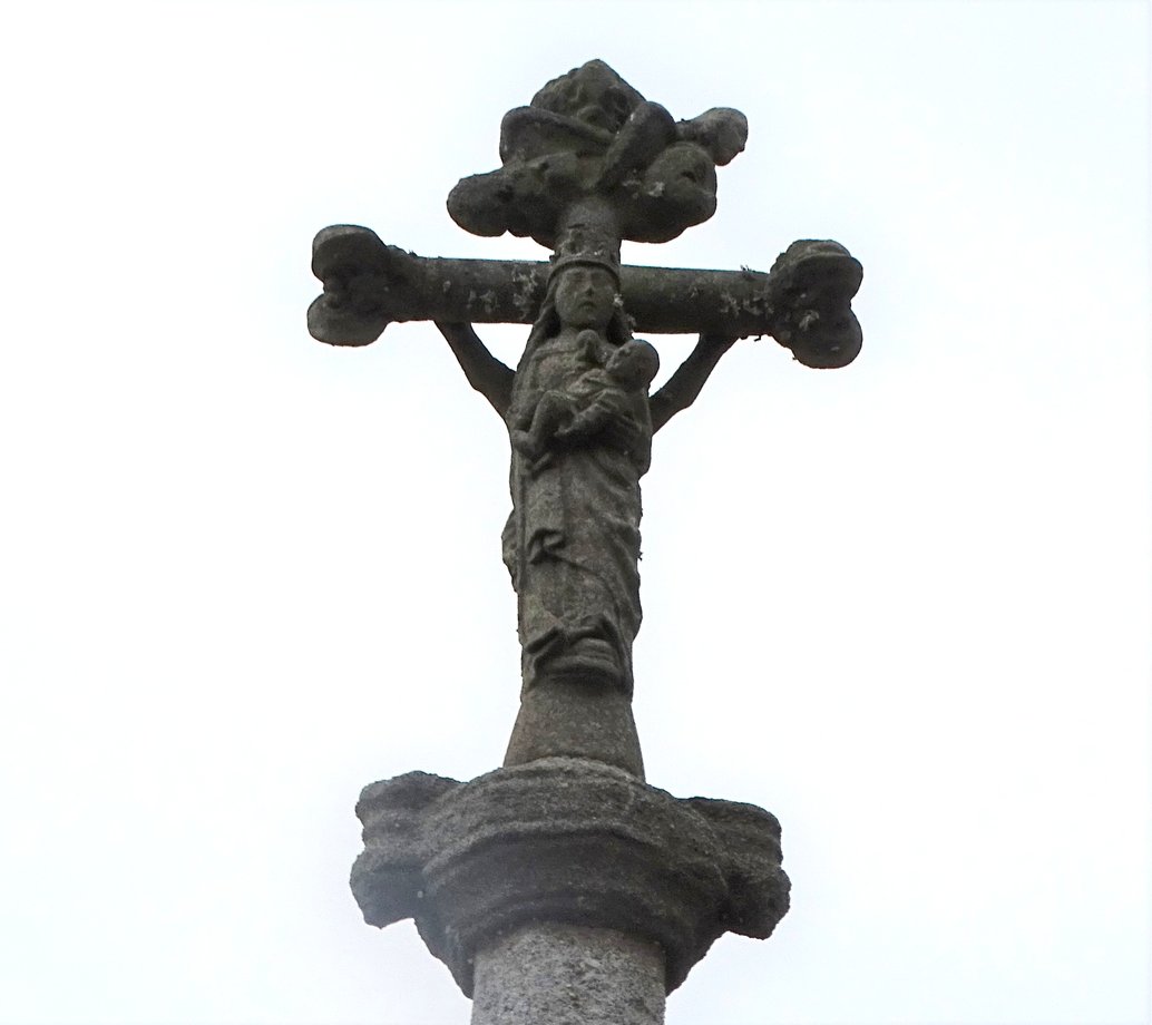 1844. Languien + g. 3,50 m. XVIè s. 1733. Trois degrés. Socle à griffes: 1733 0 CRVX AVE. LOUIS ET IEANE CADIOU. Fût, chapiteau. Croix de section carrée, chanfreins, crucifix, Vierge à l’Enfant. [YPC 1980]