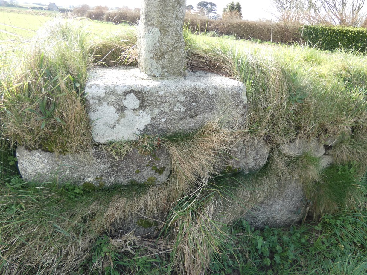 1850. Prat-Bihan + g. 5,50 m. XVIè s. Trois degrés, corniche. Socle à griffes, calice en relief. Fût à pans. Noeud, petite croix de section octogonale. [YPC 1980]