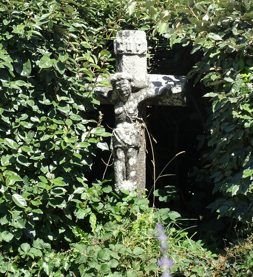 1834. Baradozic, g. k. 4 m. XVIè s. Trois degrés, corniche. Socle cubique, banderole avec inscription. Fût à griffes hautes. Croisillon à culots. Vestige d’un groupe de la Trinité en place de croix. [YPC 1980]