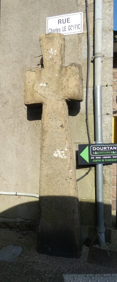 1848. Plouescat, rue Charles-Le-Goffic, g. 2,70 m. Haut Moyen Age. Croix monolithe pattée, le sommet en talon. (Stany GAUTHIER, Croix et calvaires de Bretagne, p. 26). [YPC 1980]