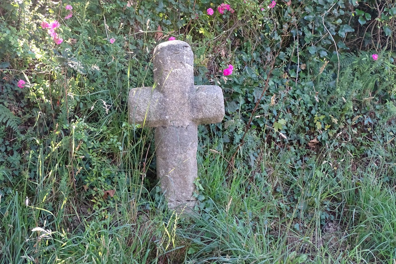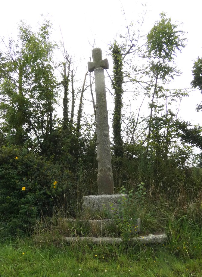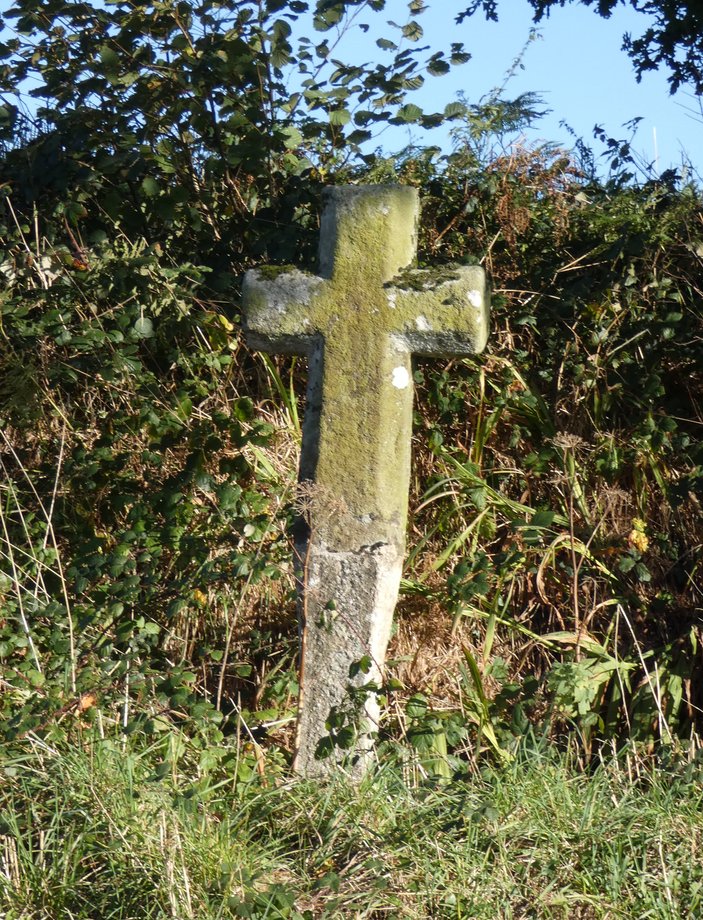2262. Kerillien, g. 1,20 m. Haut Moyen Age. Appuyée contre le talus sans socle apparent. Croix monolithe, branche haute pointue, pattée largement sur chanfrein. [YPC 1980]