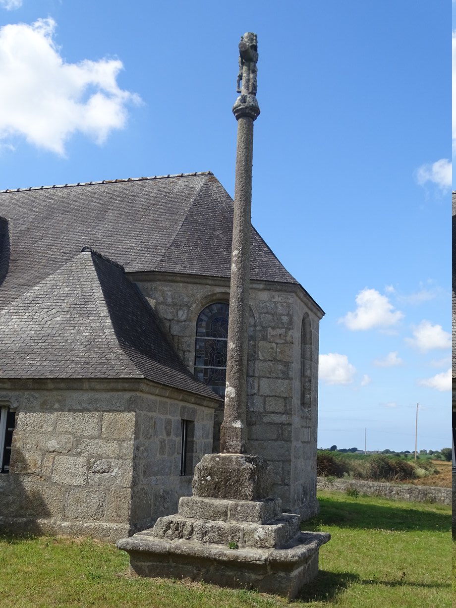 2266. Locmélar, placître de la chapelle, g. k. 6 m. XVIè s. Trois degrés. Socle cubique à griffes. Fût rond élevé, chapiteau. Croix , branches rondes, dais, crucifix, Vierge à l’Enfant. [YPC 1980]