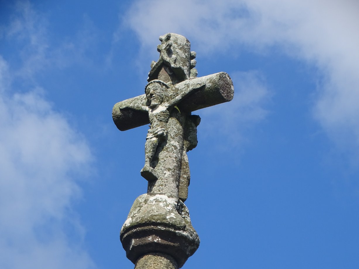 2271. Plounéventer, église, g. k. 8 m. Vers 1578, 1867. Vaste soubassement de plan hexagonal, corniche, trois marches au devant. Socles de plan octogonal. Croisillon, trois marmousets se tenant les bras, trois autres, sur les côtés et au revers, statues modernes: Jean, Yves (?), au centre saint Georges, au revers Vierge de Pitié. Croisillon du haut, formés d’anges dont les ailes se rejoignent, statues: ermite, Jean. Croix, branches rondes, fleurons, crucifix, titulus rubanné. Pièces anciennes et grosses restaurations qui semblent de la main de Larhantec. [YPC 1980]