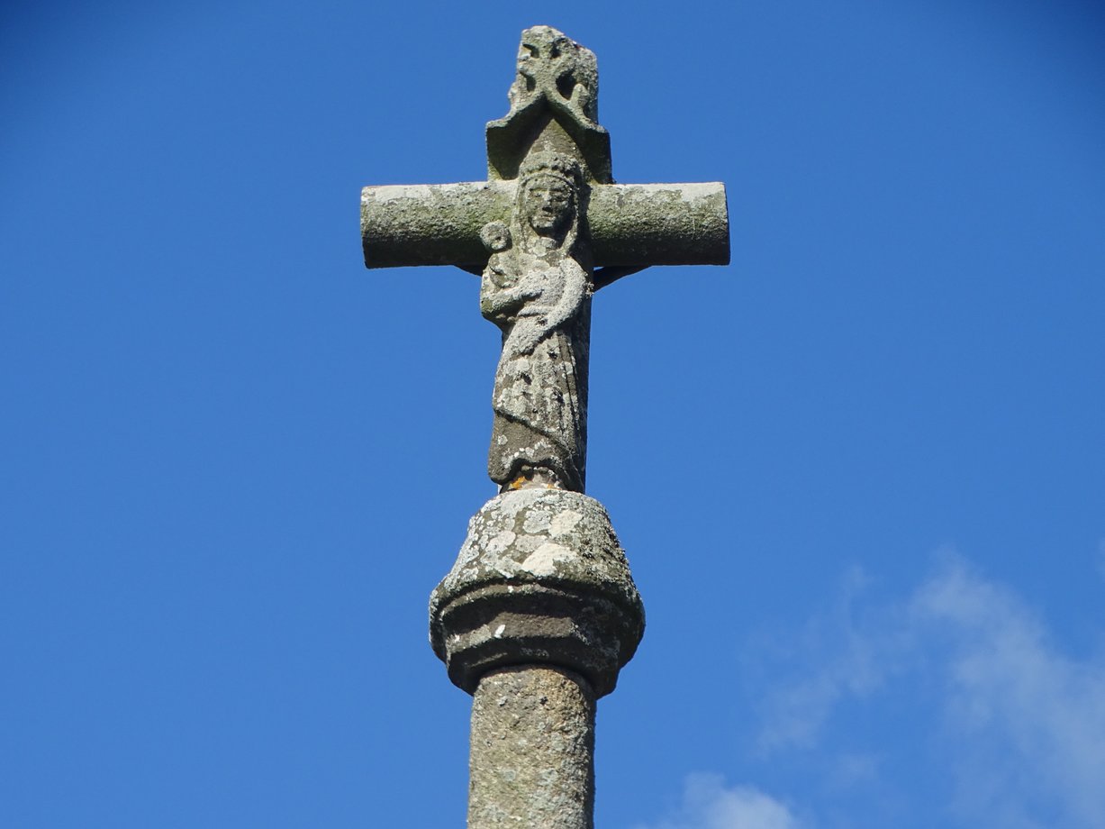 2269. Penguilly E, Croix-de-Keradennoc, g. k. Moyen Age, 1552. Soubassement à trois nivaux, corniche. Socle, larges griffes, Vierge de Pitié. Croix pattée sur chanfrein. [YPC 1980]