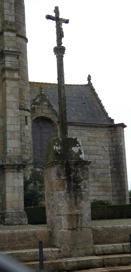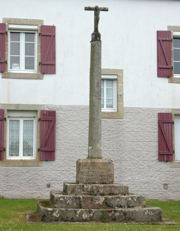 2320. Plourin-lès-Morlaix S-E, allée de Coatélan, sur le site d’un ancien cimetière (Vered-Vian), g. k. 5 m. 1559. Trois degrés. Socle cubique: YVO LE PODER FIT FAIRE CESTE + A LA MILL VCTS LVIV. Fût à pans, noeud, petite console. Croix, branches rondes, crucifix. [YPC 1980]