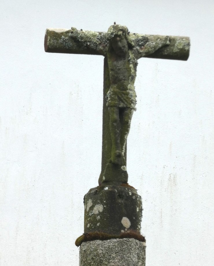 2323. Sycomore + g. k. 5 m. XVIè s. Soubassement, table reposoir, gradin. Socle cubique: GUILLE LE RAMP ET ALYETA AN OZE SA FAME FIRET CESTE. Fût, noeud orné d’un cartouche et d’un entrelacs, écu sur l’arrière: parti d’un chef enclenché et de deux fasces: Yves de Coatanscour et J. Barbier de Kerjean, mariés en 1592. [YPC 1980]