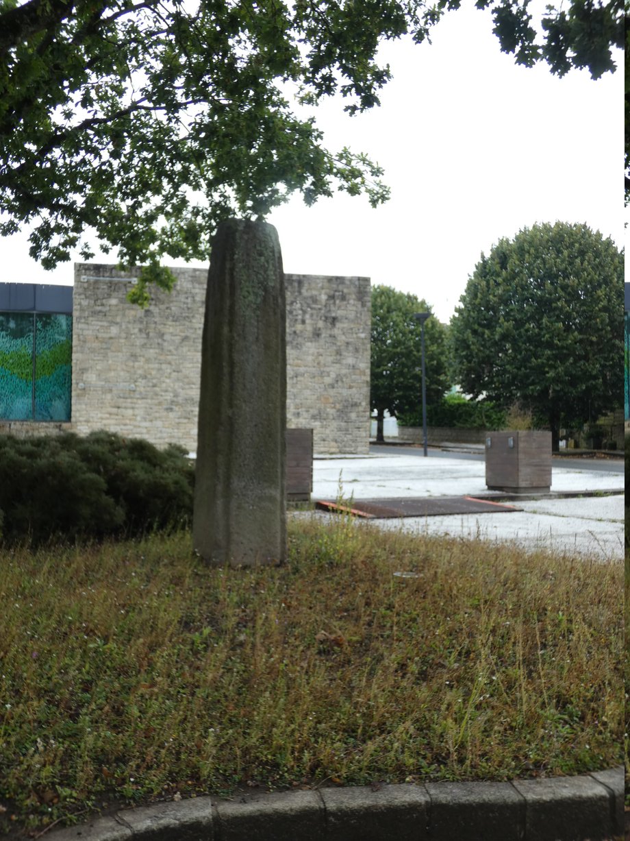 2321. Plourin-lès-Morlaix, g. 3 m. Stèle préchrétienne, listel, un téton de fer sur le sommet fait penser qu’elle a porté une croix. [YPC 1980]