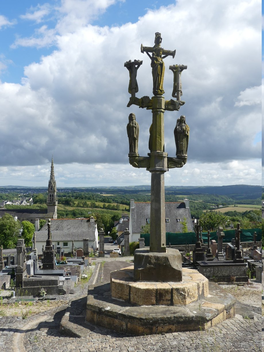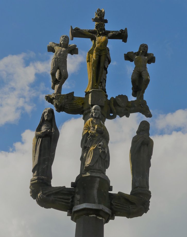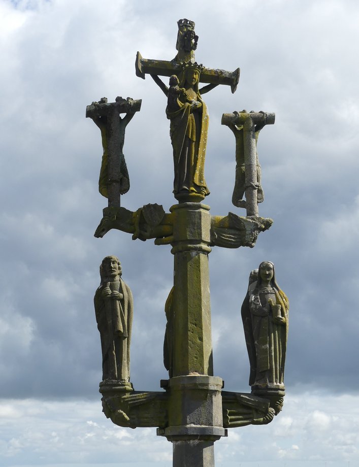 2495. Quimerc’h, cimetière, k. 6 m. XVIè s. Quatre degrés, plan octogonal. Fût court à pans. Croisillon, anges, statues géminées: Madeleine-Vierge, Jean-Paul, au centre saint Pierre. Second croisillon, ange et démon, gibets des larrons. Croix, fleurons-écus, crucifix, ange portant titulus en lettres fleuronnées. Vierge à l’Enfant. Sur le socle: MISSION 1881. [YPC 1980]