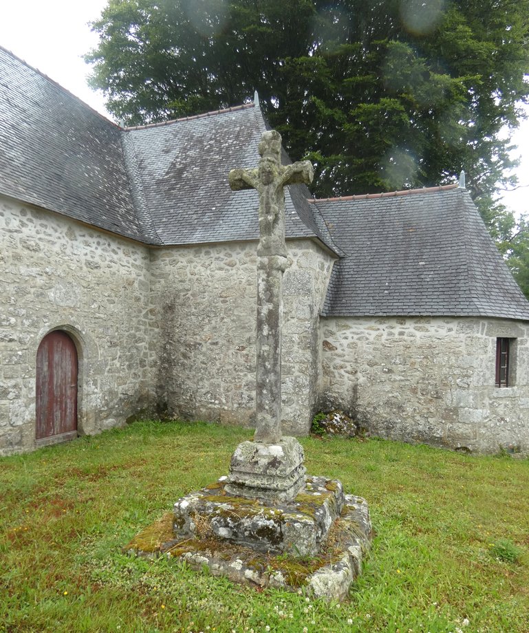 2550. Lestrivin, g. 3 m. XVIè s. Deux degrés. Socle irrégulier: MISSION 1805 (?). Croix monolithe de section octogonale, crucifix en relief. [YPC 1980]