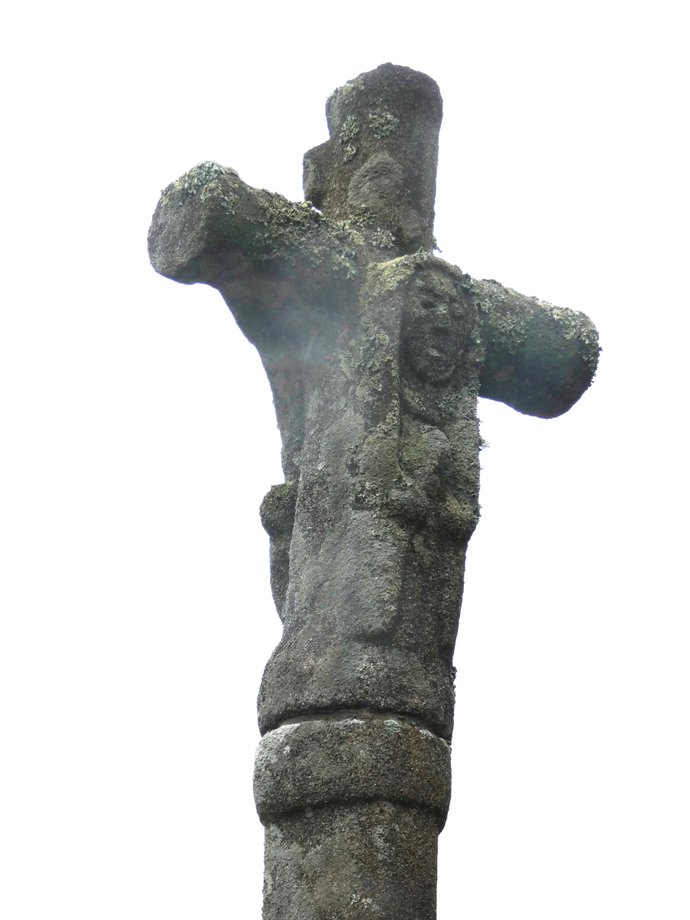 2547. Kerinec, chapelle, g. 5,50 m. XVIè s. Soubassement formé d’une chaire à prêcher de plan circulaire, pupitre soutenu par un masque grotesque qui se bouche les oreilles. Socle cubique. Croix monolithe de section octogonale, portant gibets des larrons sur les branches (disparus). Croix à pans, crucifix. [YPC 1980]