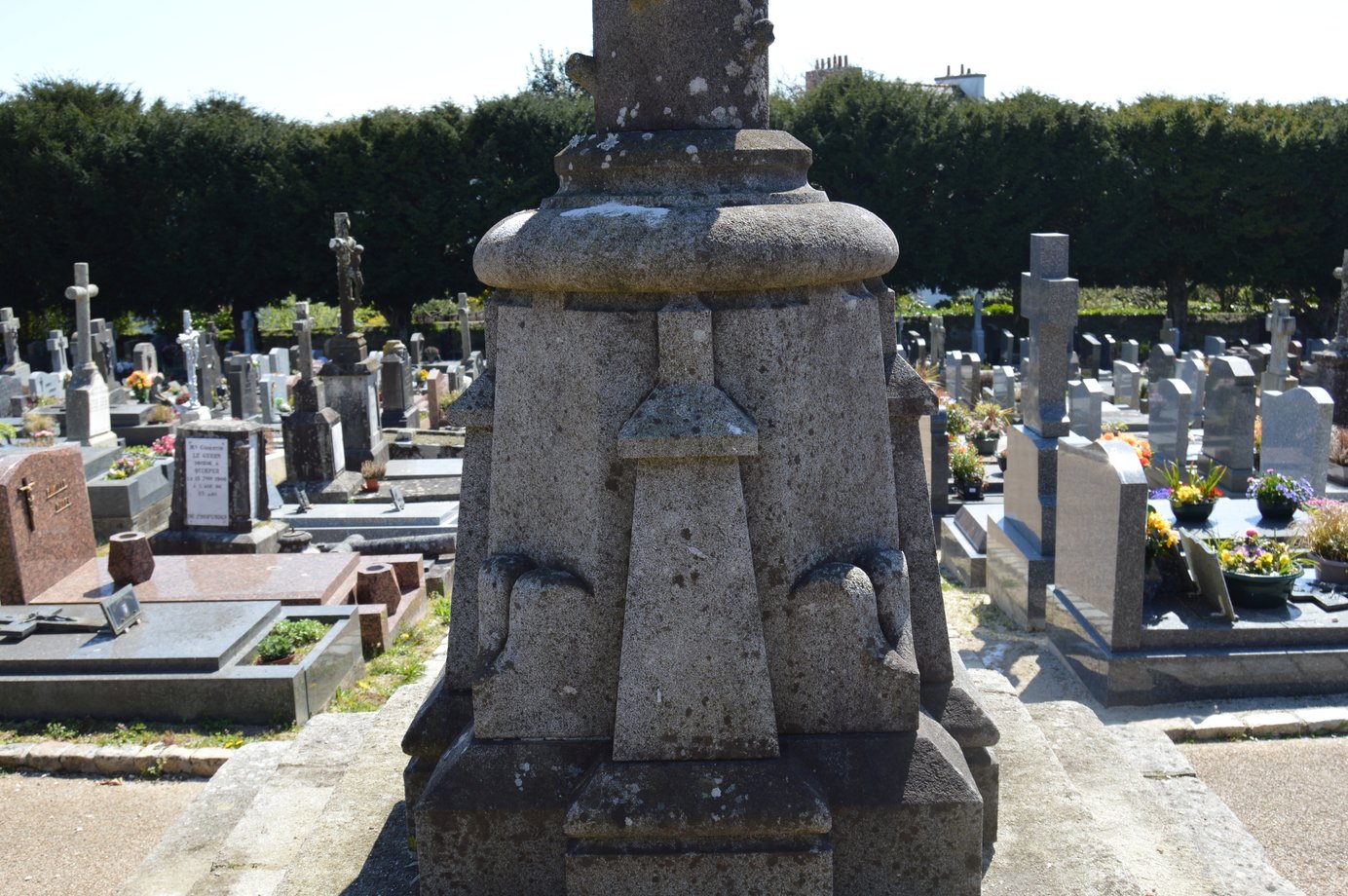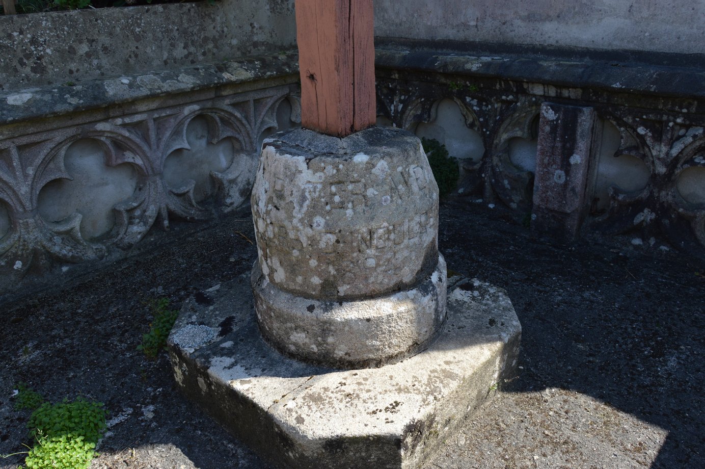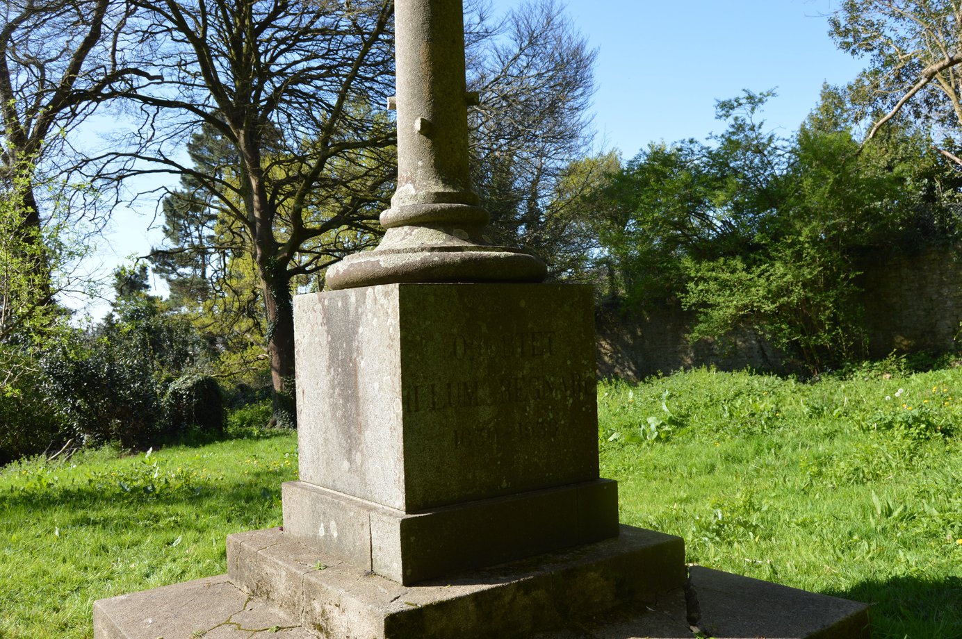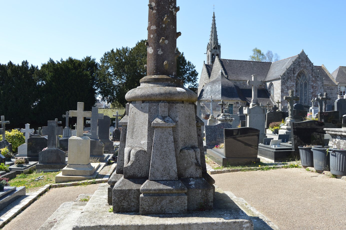 2607. Quimper, cimetière Saint-Joseph, avenue de la France-Libre, k. 7 m. 1865, par Poilleu aîné et fils. Deux degrés. Soubassement élevé, corniche. Socle carré. Fût rond, écots. Croix, branches rondes, crucifix. Titulus brisé posé sur les marches. [YPC 1980]