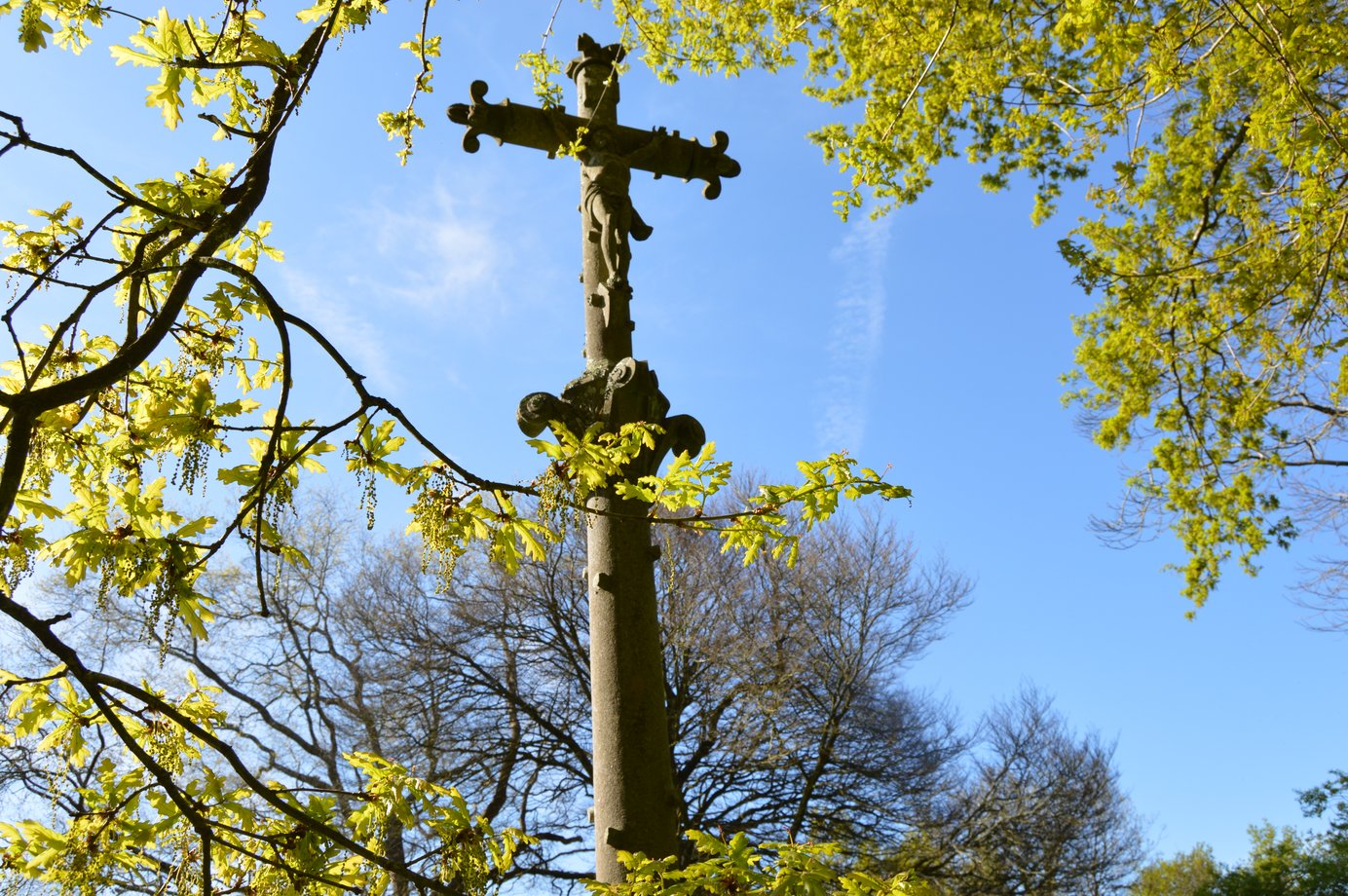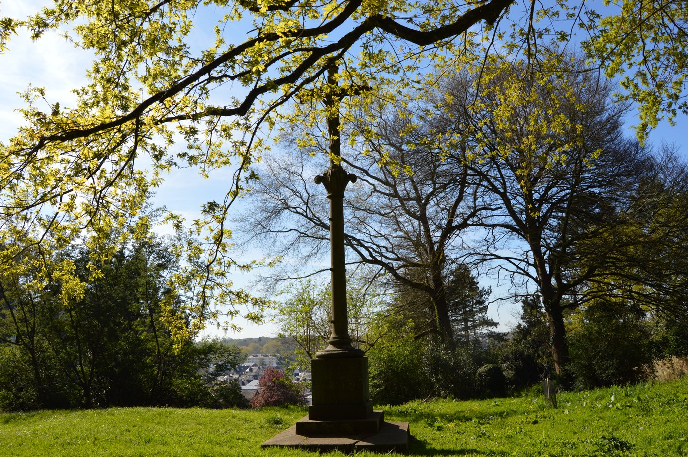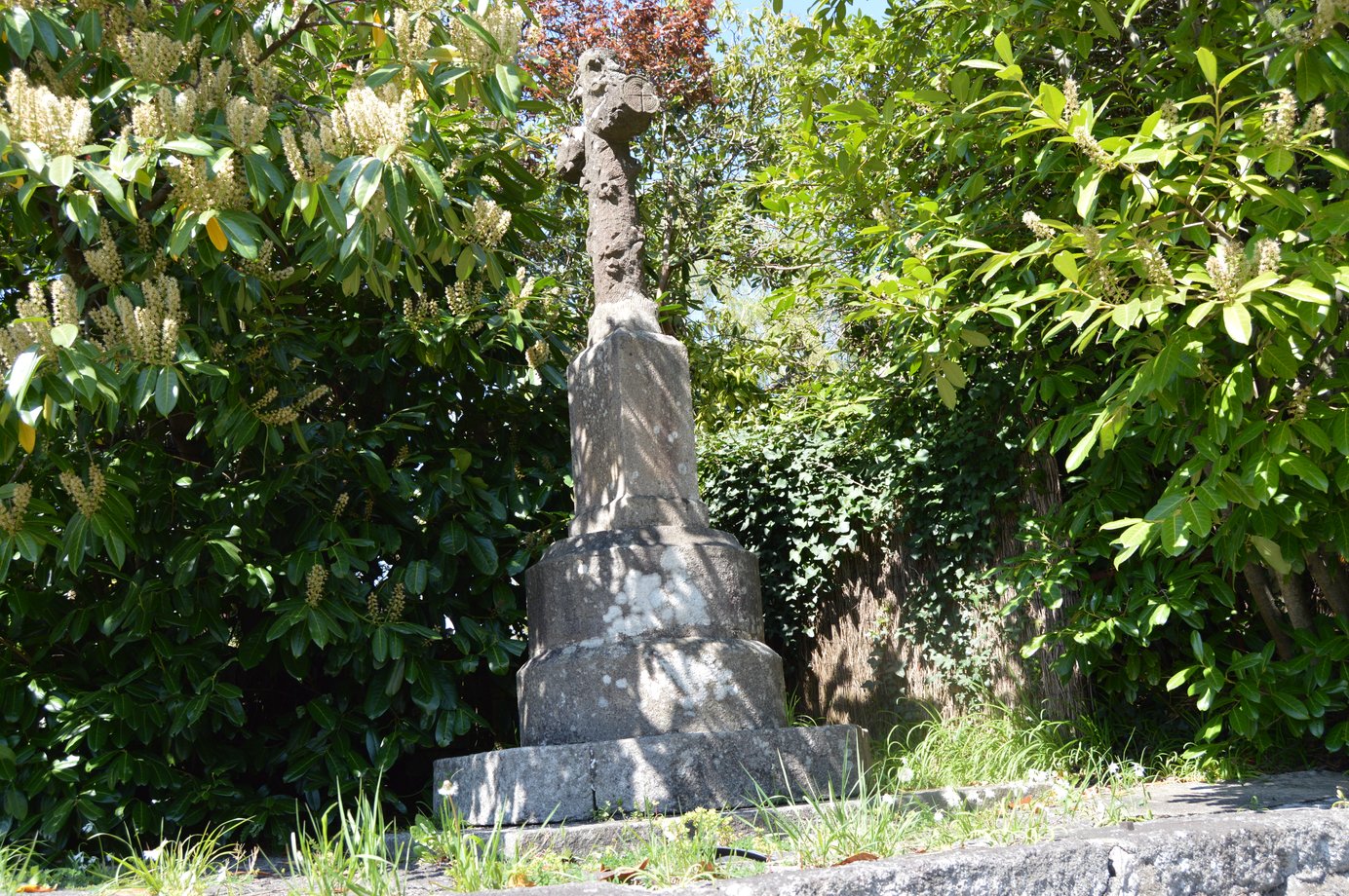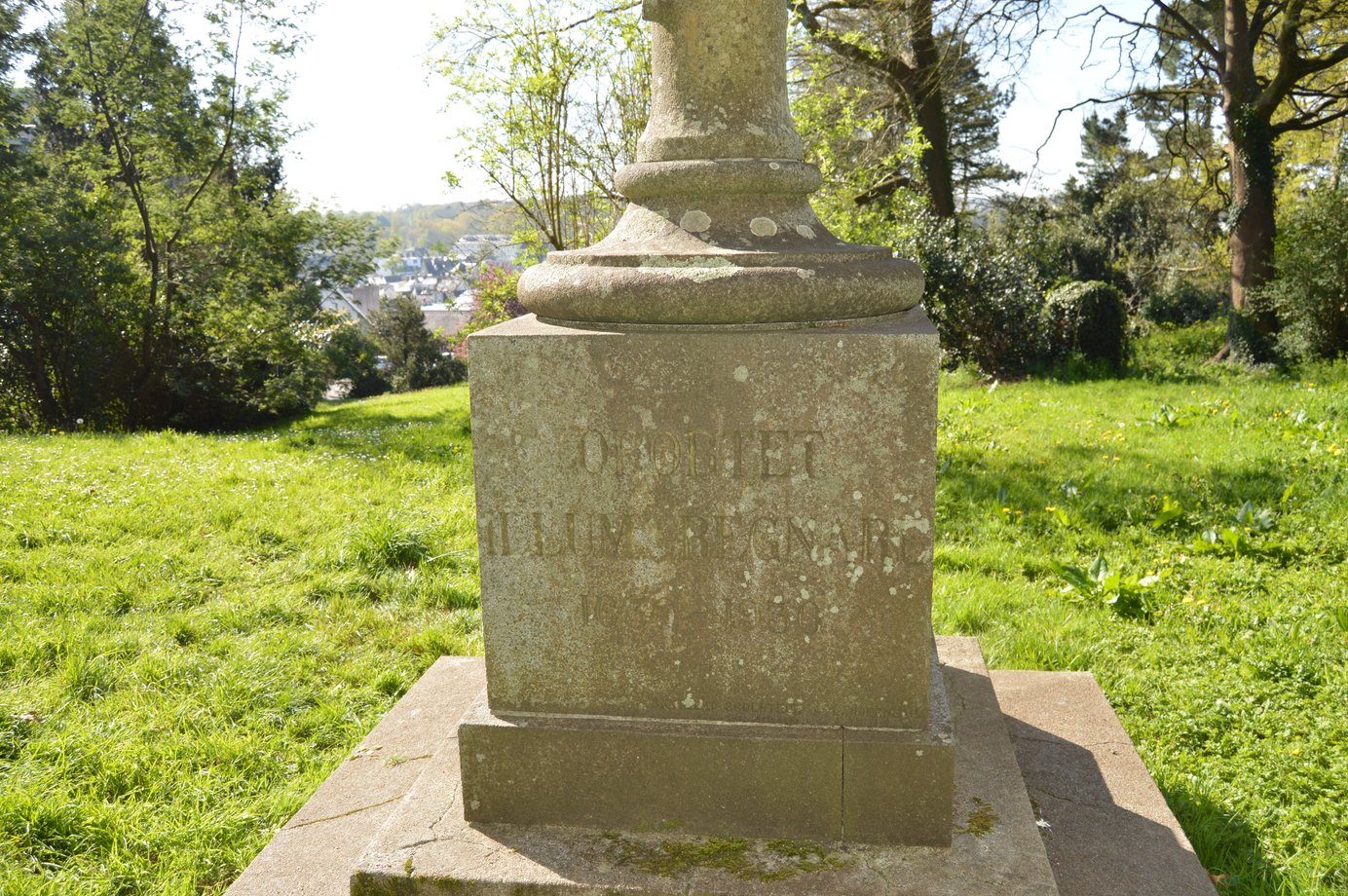 2607. Quimper, cimetière Saint-Joseph, avenue de la France-Libre, k. 7 m. 1865, par Poilleu aîné et fils. Deux degrés. Soubassement élevé, corniche. Socle carré. Fût rond, écots. Croix, branches rondes, crucifix. Titulus brisé posé sur les marches. [YPC 1980]