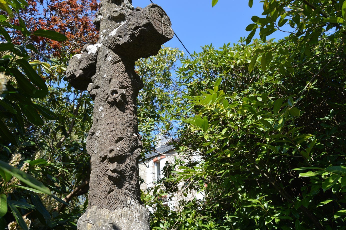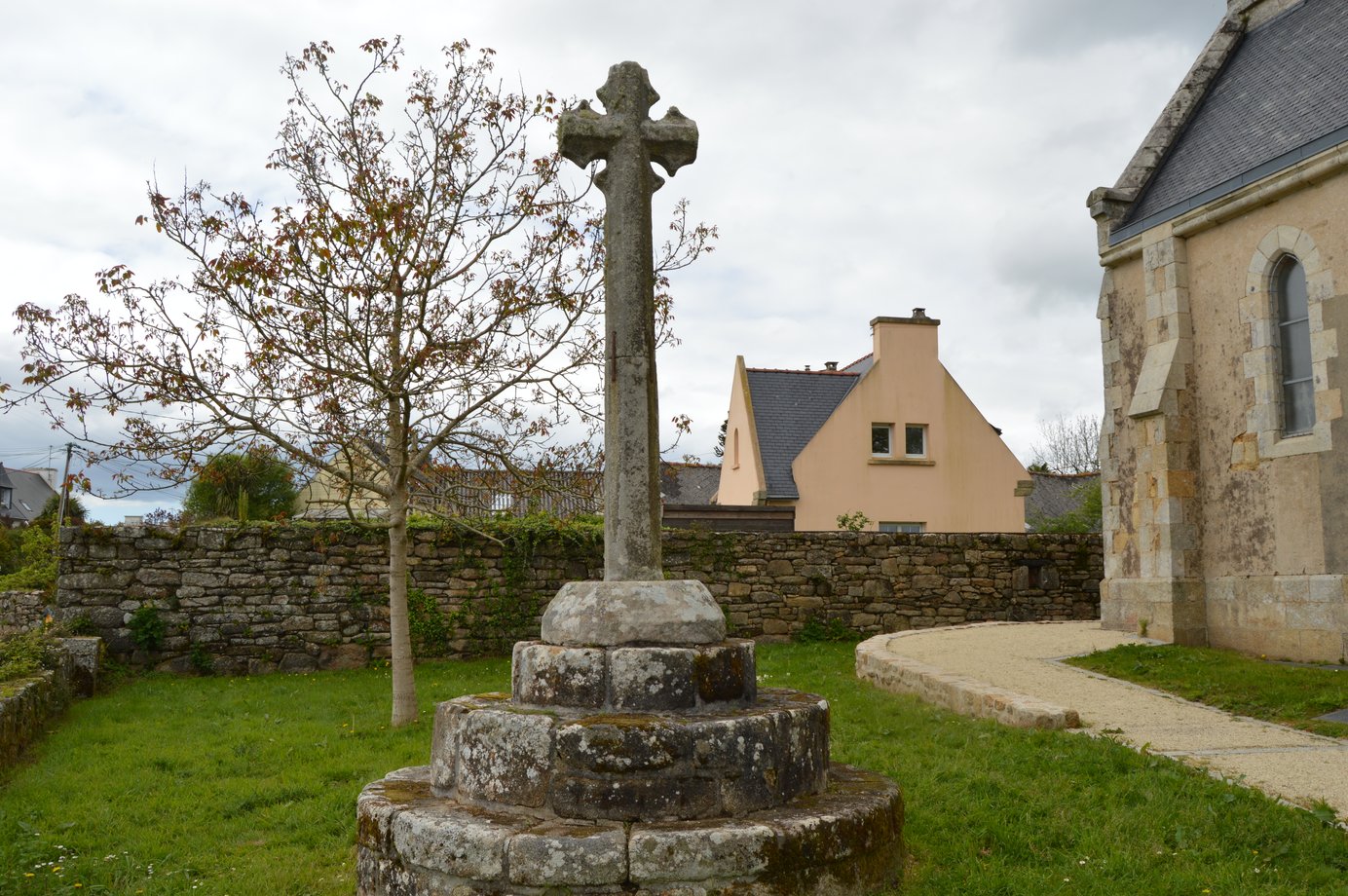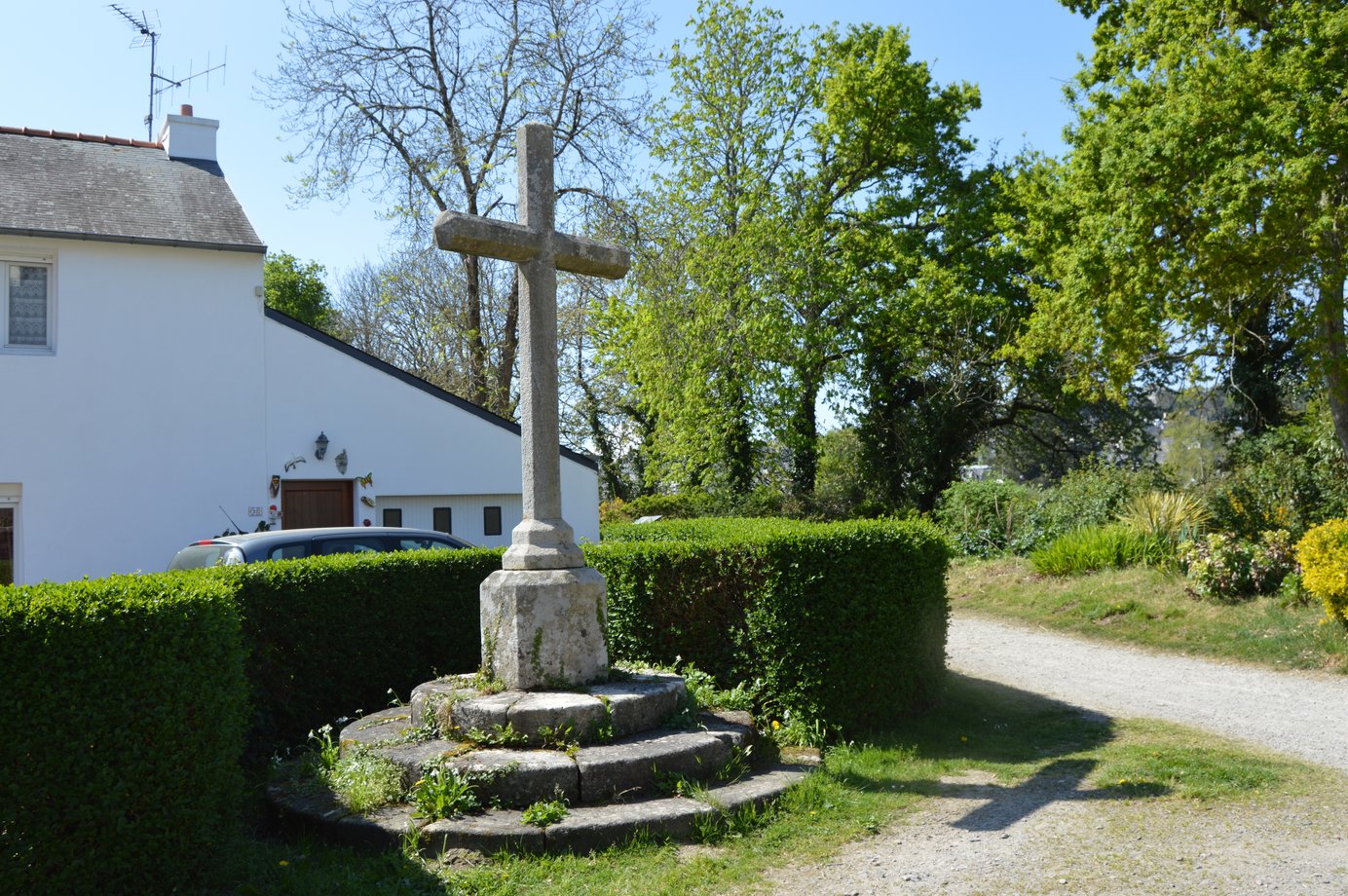 2593. Kerfeunteun, Cuzon, chapelle Saint-Pierre, g. 5 m. Moyen Age. Soubassement à trois niveaux de plan circulaire comme le socle. Fût à pans, écu. Croix à branches trilobées. [YPC 1980]