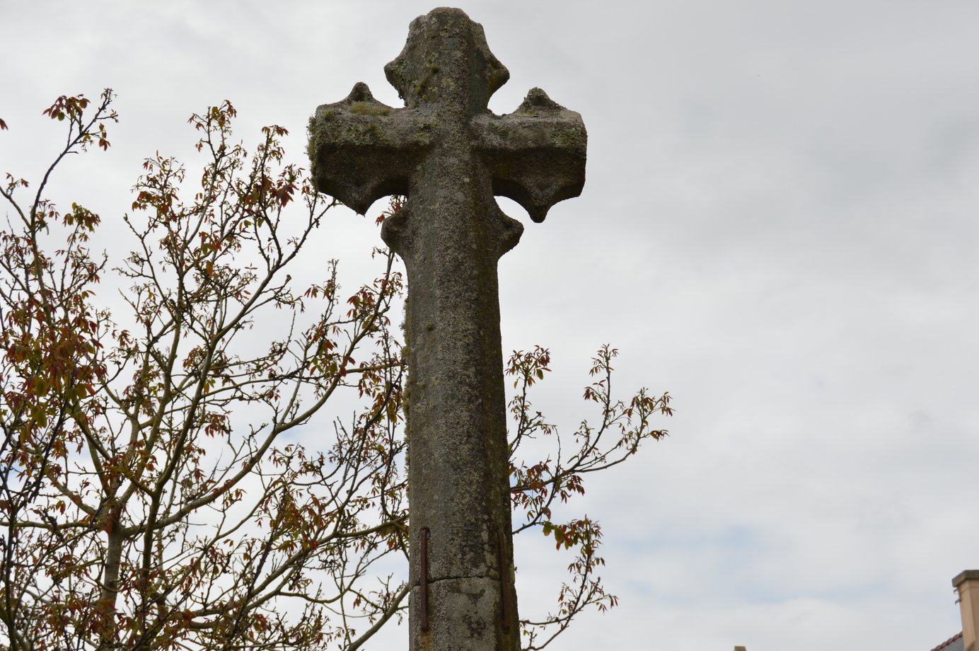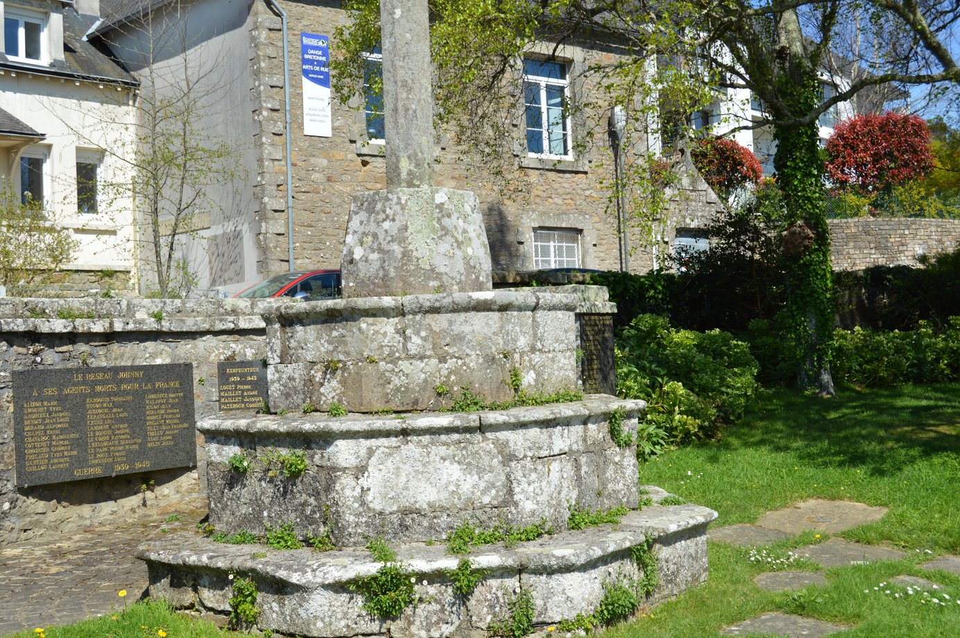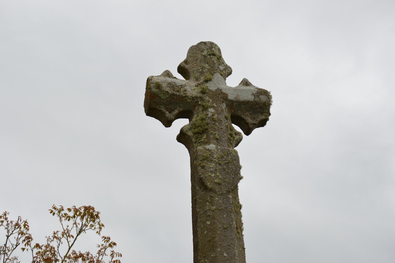 2593. Kerfeunteun, Cuzon, chapelle Saint-Pierre, g. 5 m. Moyen Age. Soubassement à trois niveaux de plan circulaire comme le socle. Fût à pans, écu. Croix à branches trilobées. [YPC 1980]