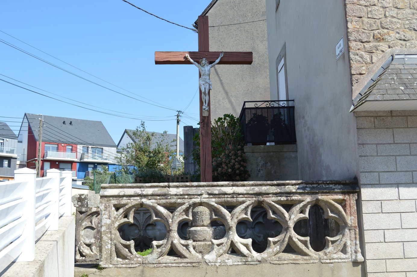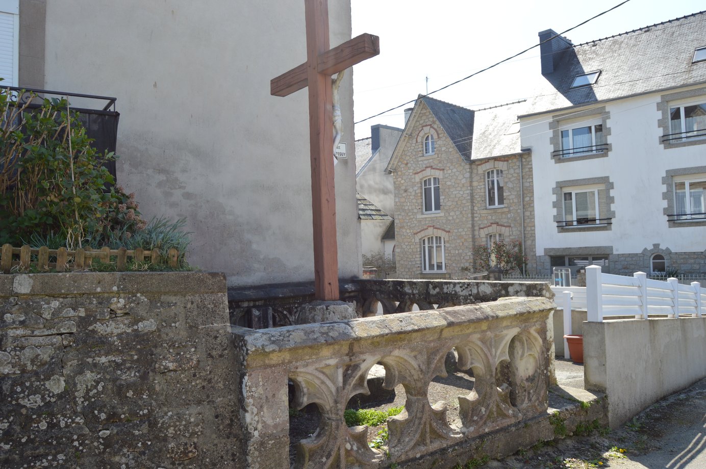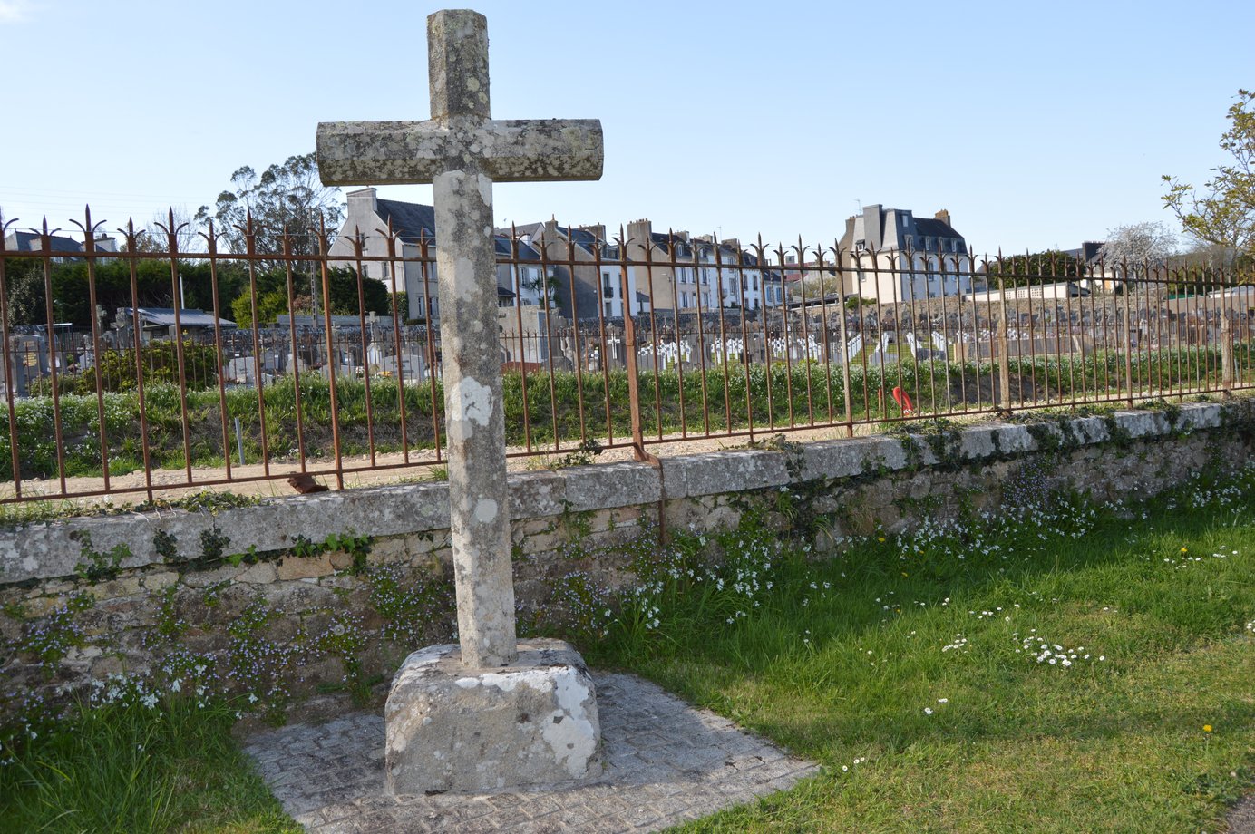 2598. Locmaria N-0, rue du Commandant Avril, g. 4 m. XIXè s. Trois degrés circulaires. Socle. Croix de section octogonale, branches pointues. [YPC 1980]