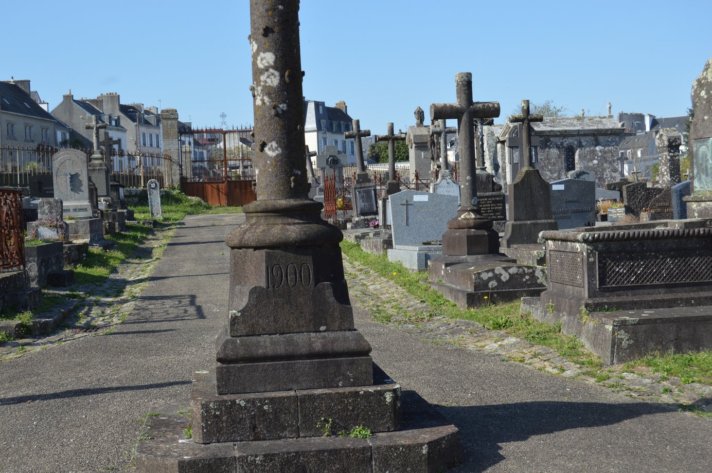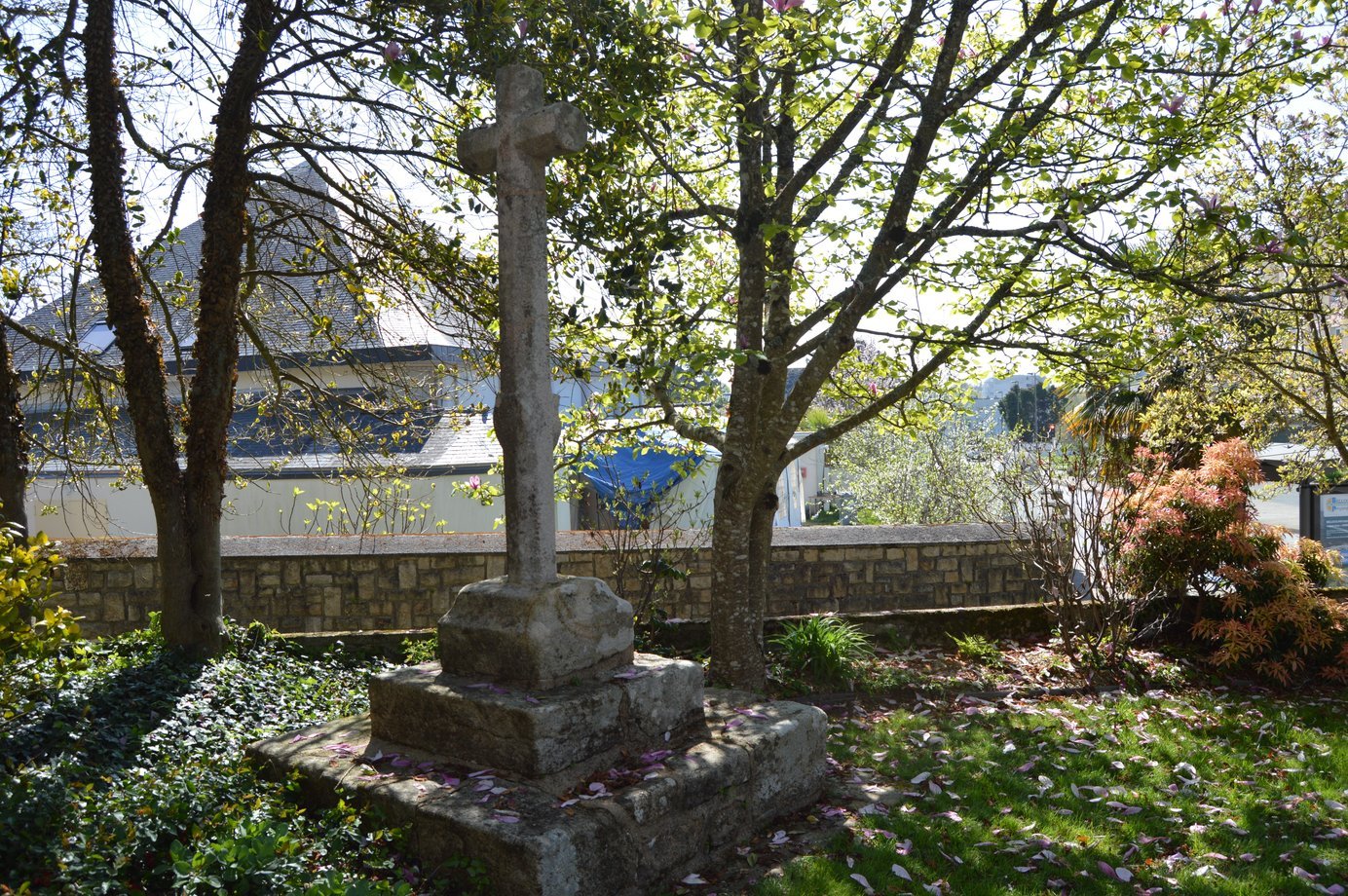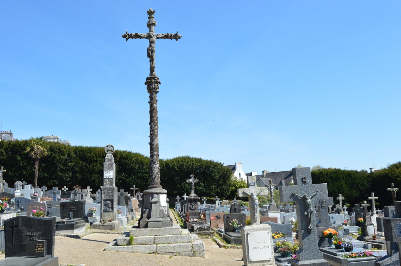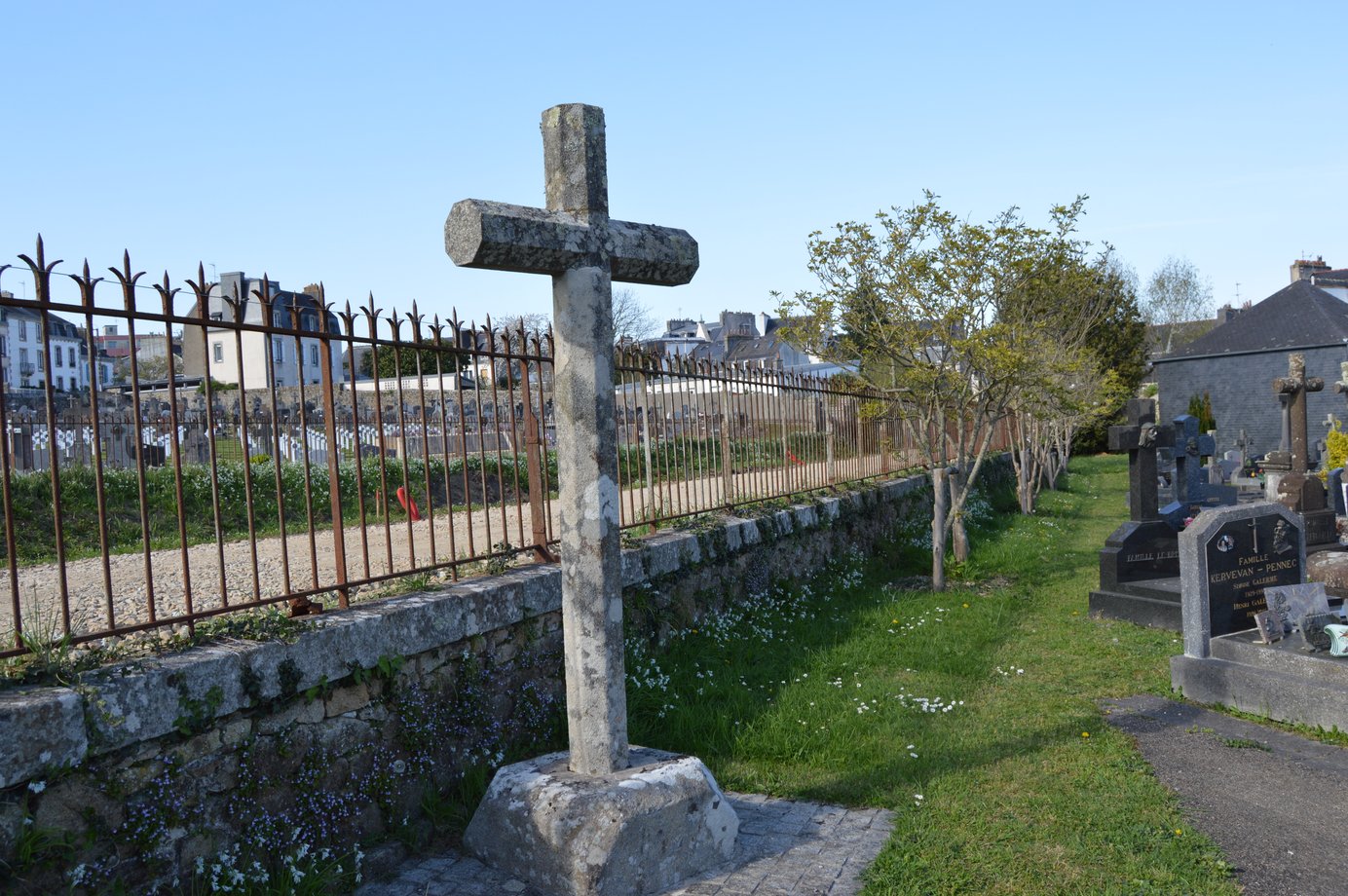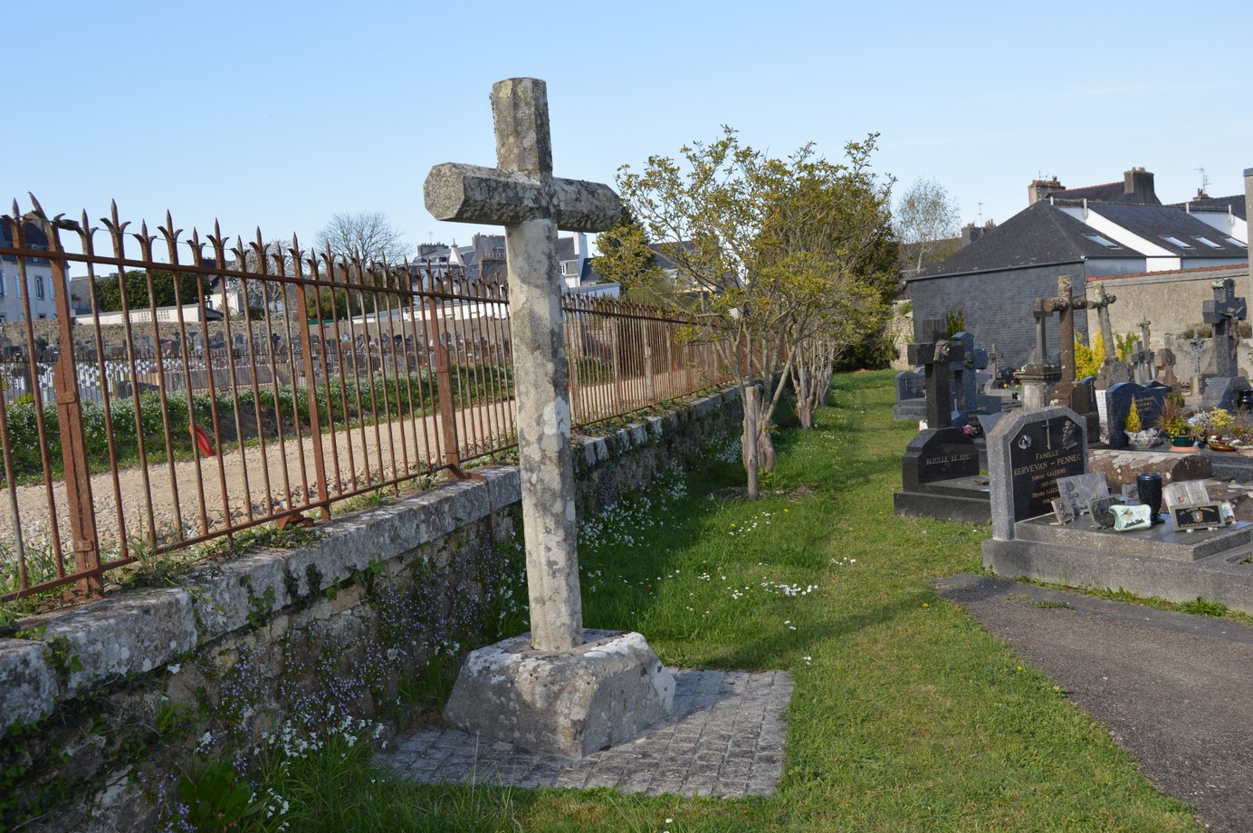 2597. Kerfeunteun, séminaire, cimetière, g. 3,50m. 1889, 1948. Trois degrés. Socle cubique, pans: 1889 1948. Croix, branches trilobées. Se dressait naguère dans l’ancien séminaire, route de Pont-l’Abbé. [YPC 1980]
