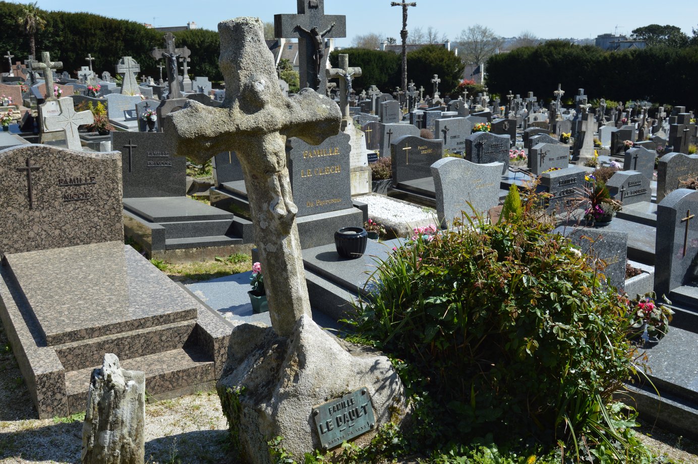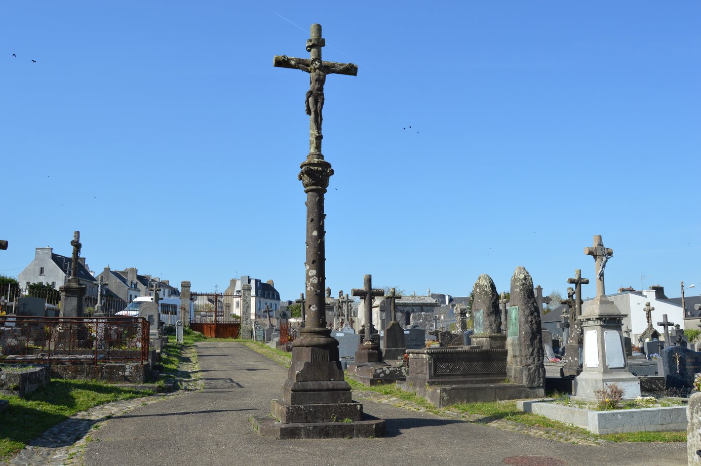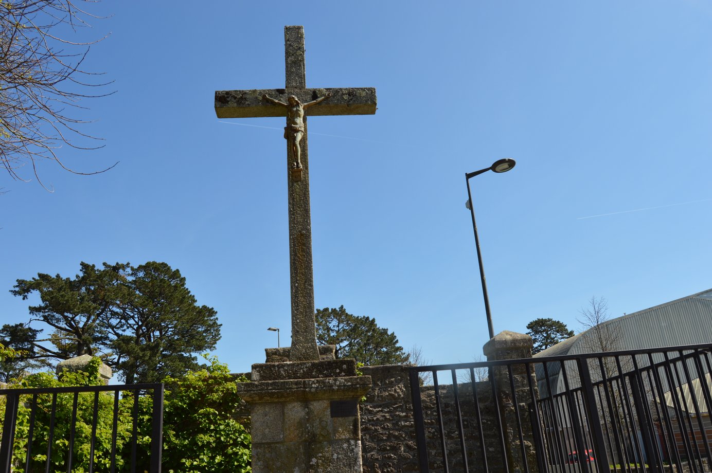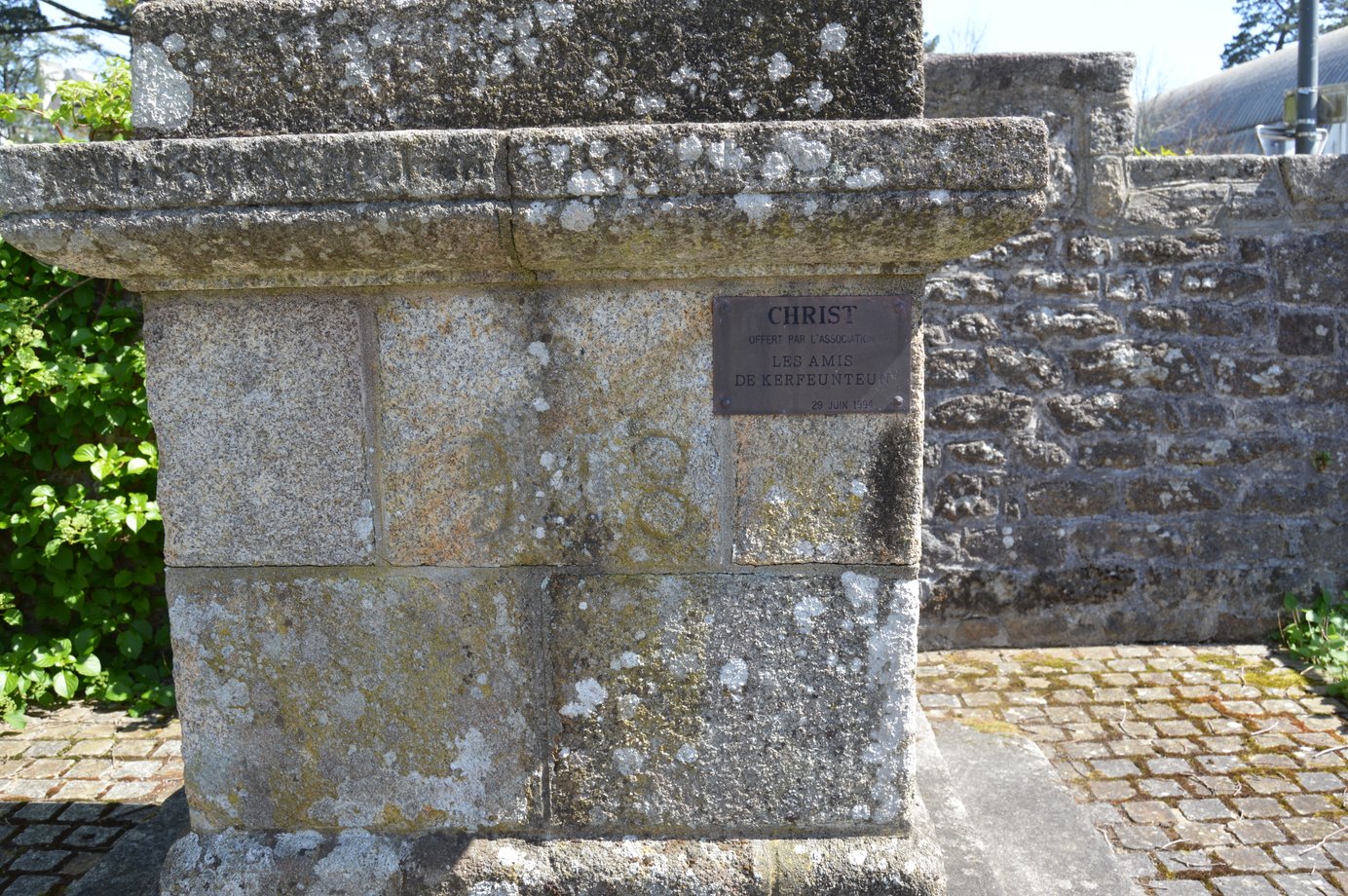 2597. Kerfeunteun, séminaire, cimetière, g. 3,50m. 1889, 1948. Trois degrés. Socle cubique, pans: 1889 1948. Croix, branches trilobées. Se dressait naguère dans l’ancien séminaire, route de Pont-l’Abbé. [YPC 1980]