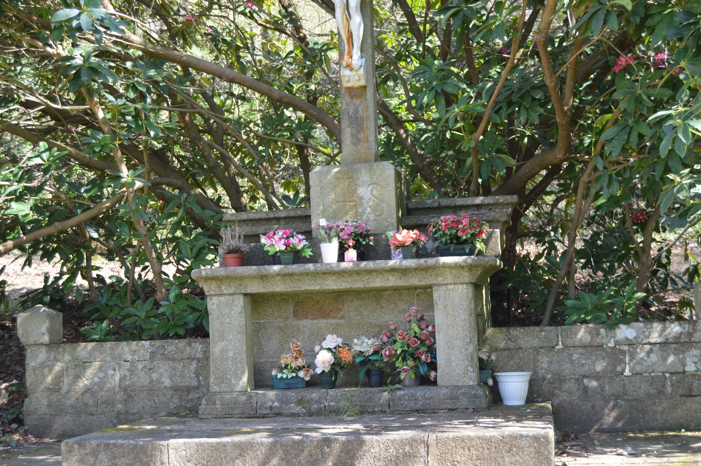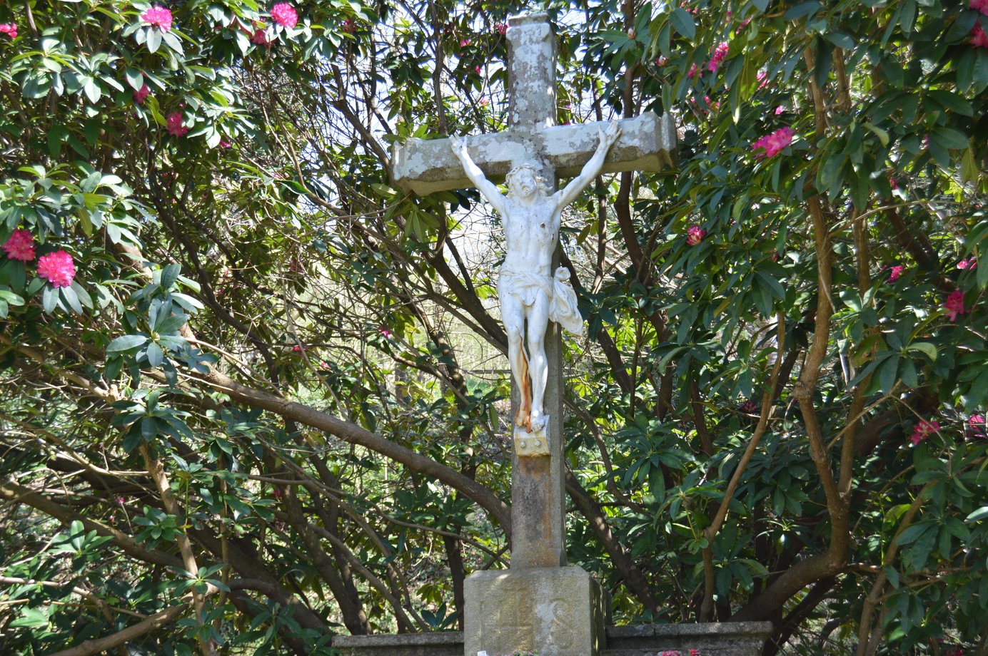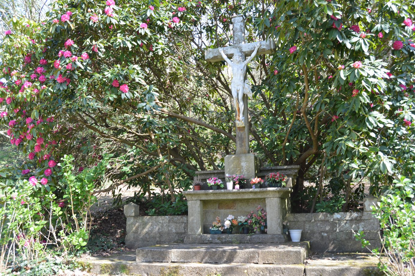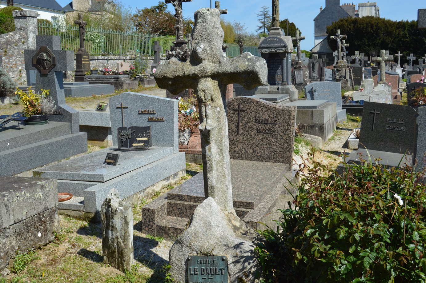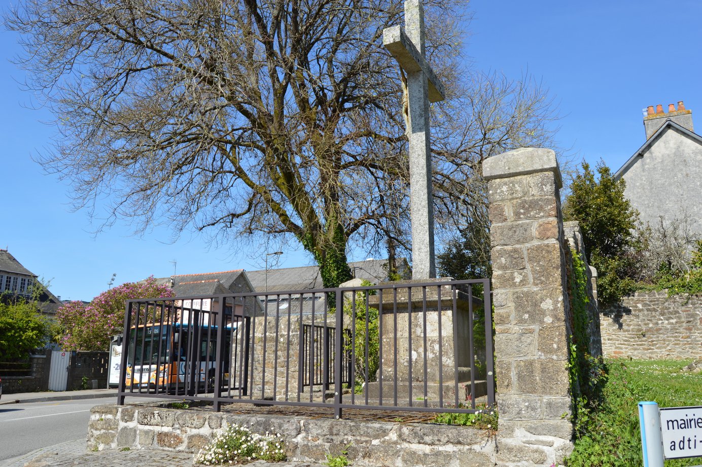 2597. Kerfeunteun, séminaire, cimetière, g. 3,50m. 1889, 1948. Trois degrés. Socle cubique, pans: 1889 1948. Croix, branches trilobées. Se dressait naguère dans l’ancien séminaire, route de Pont-l’Abbé. [YPC 1980]