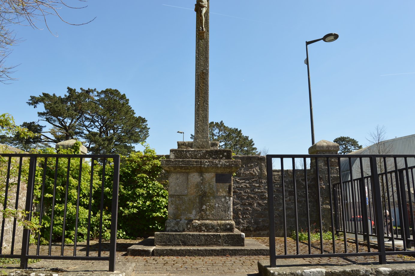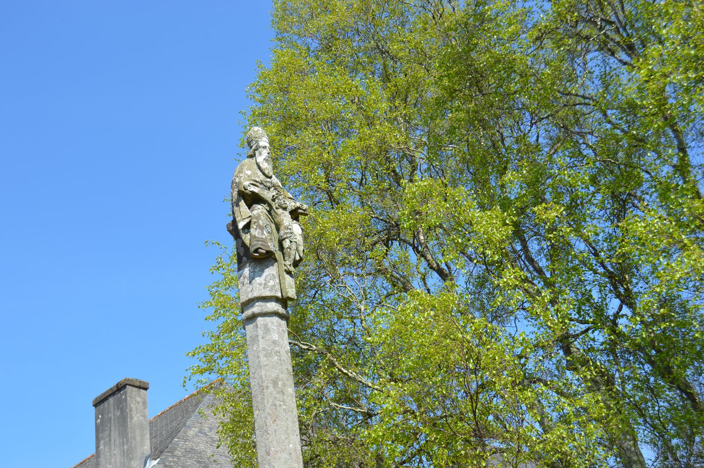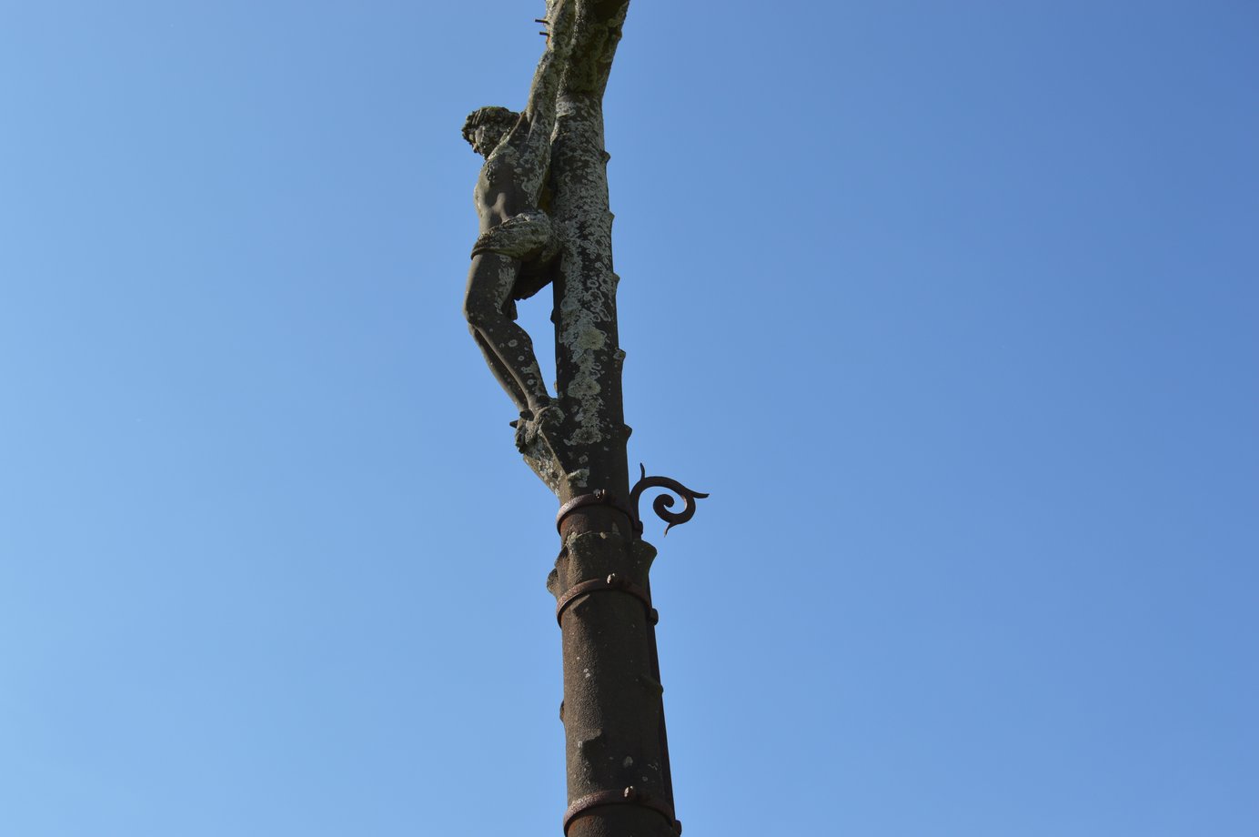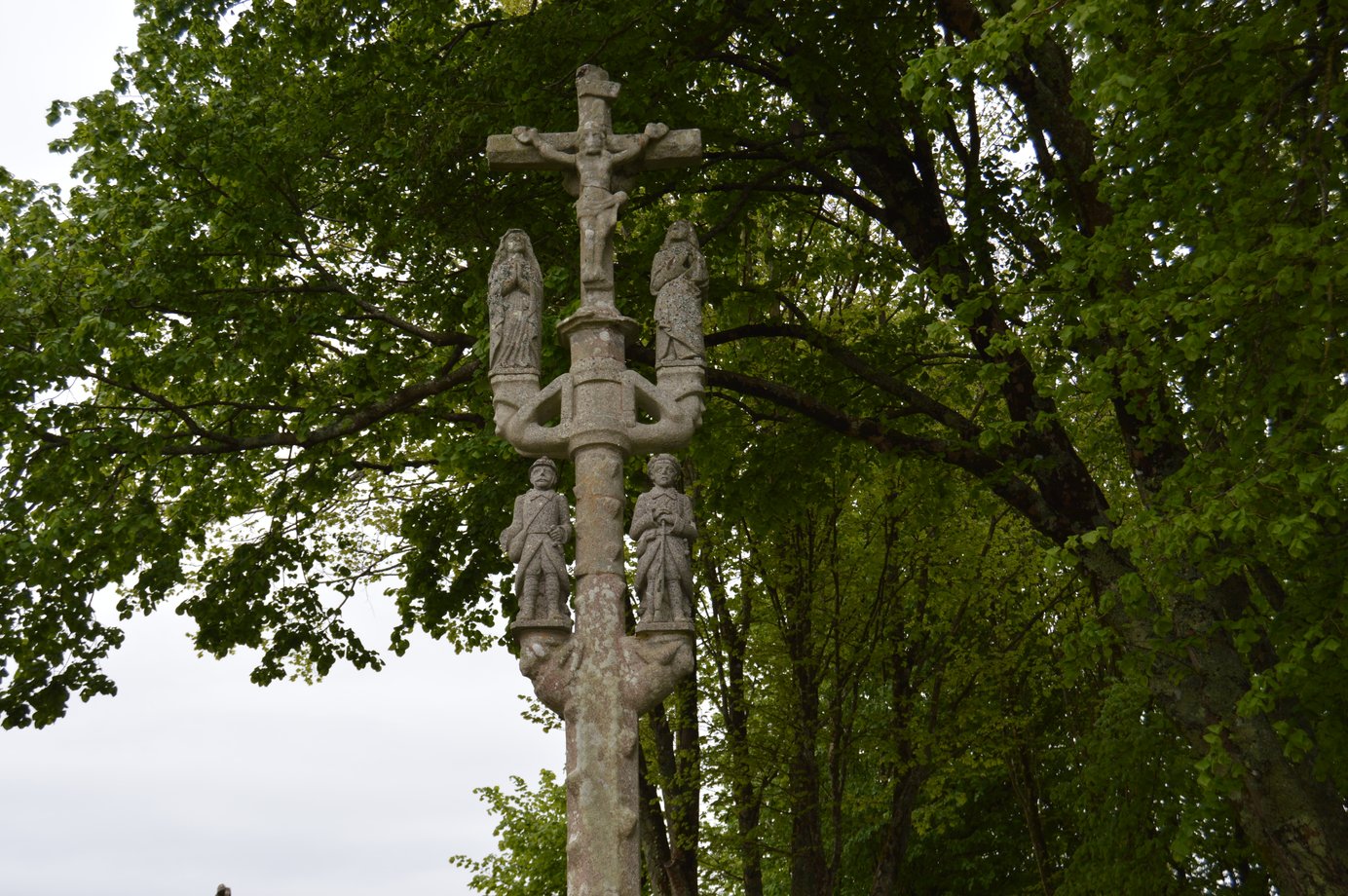 2592. Kerfeunteun, église, g. k. 5,50 m. XVIè s. Soubassement de plan octogonal, corniches. Socle, pans. Fût. Groupe de la Trinité, où se détache la croix. [YPC 1980]